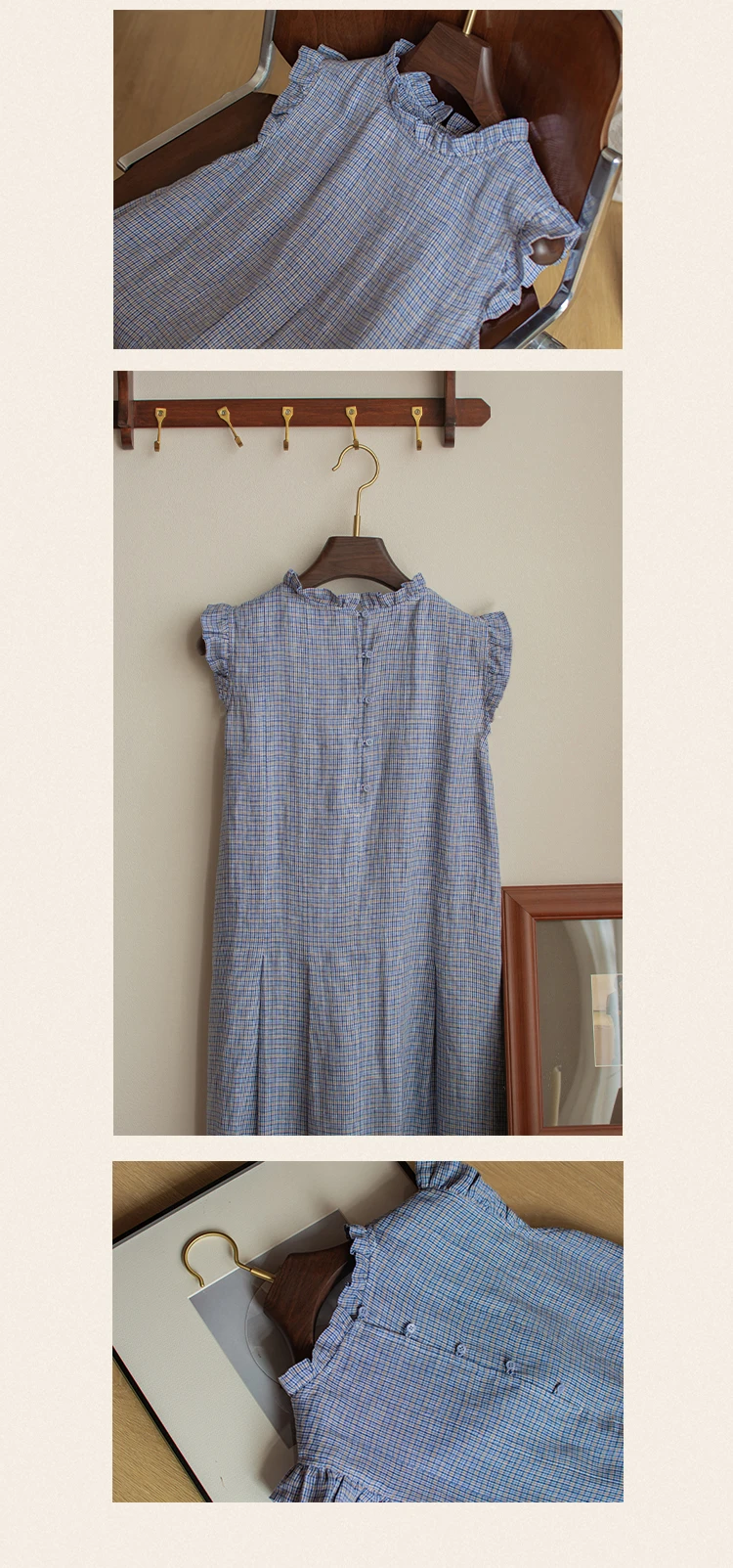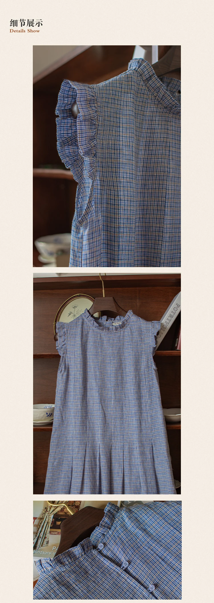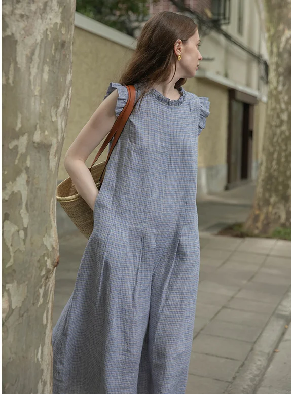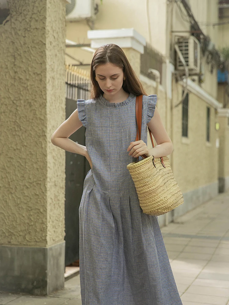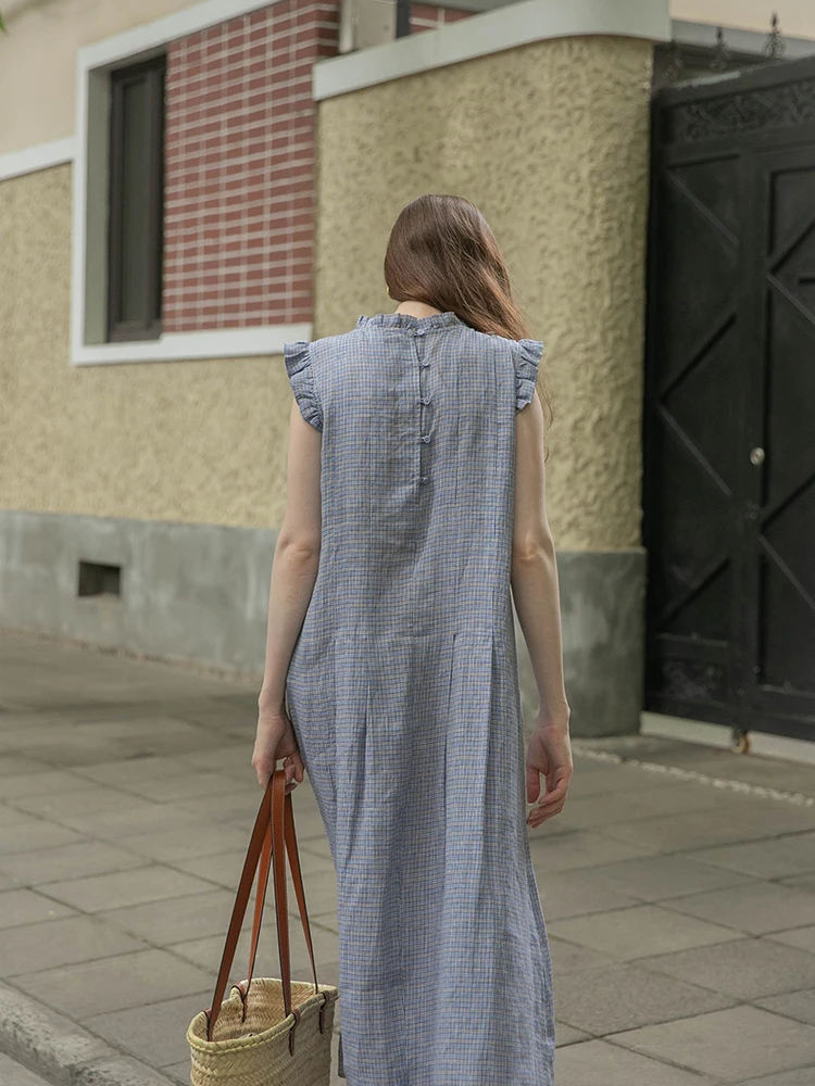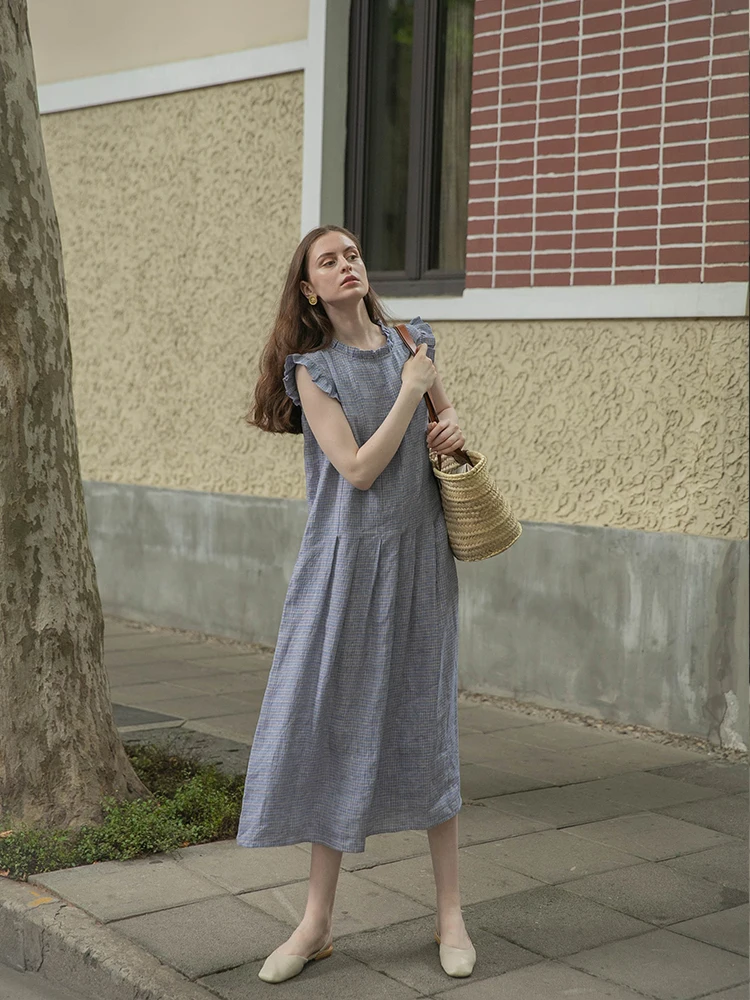 100% pure linen casual gingham dress women's sleepwear linen pajama woman Sleep Dress night Gown lounge dress