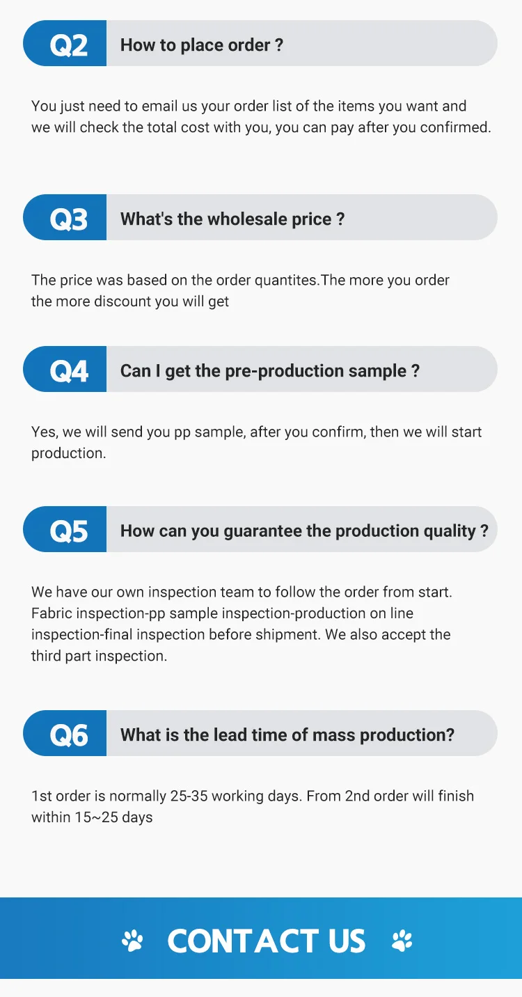 We have our own inspection team to follow the order from start. Fabric inspection--pp sample inspection--production on line inspection--final inspection before shipment. We also accept the third part inspection.