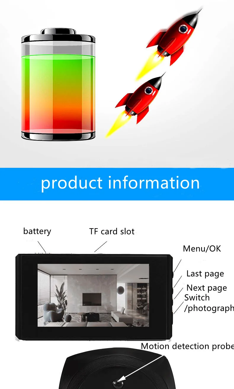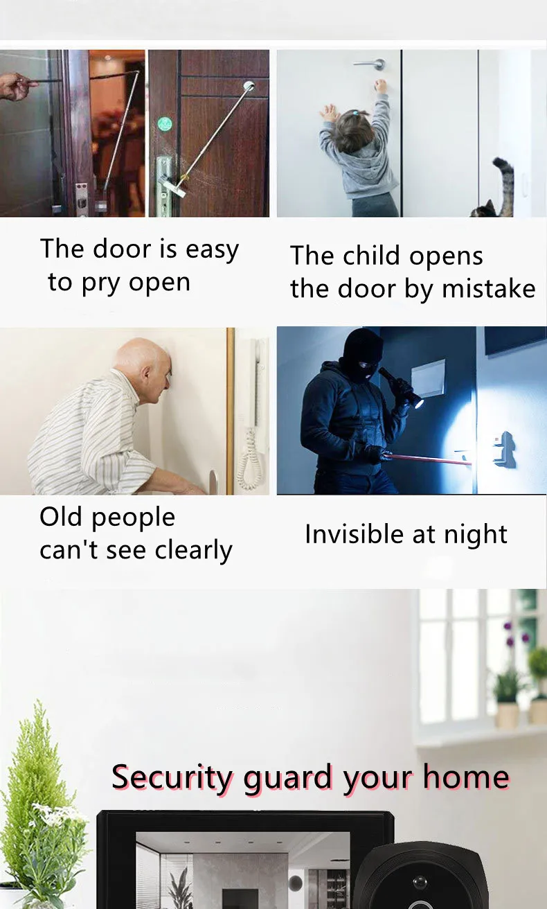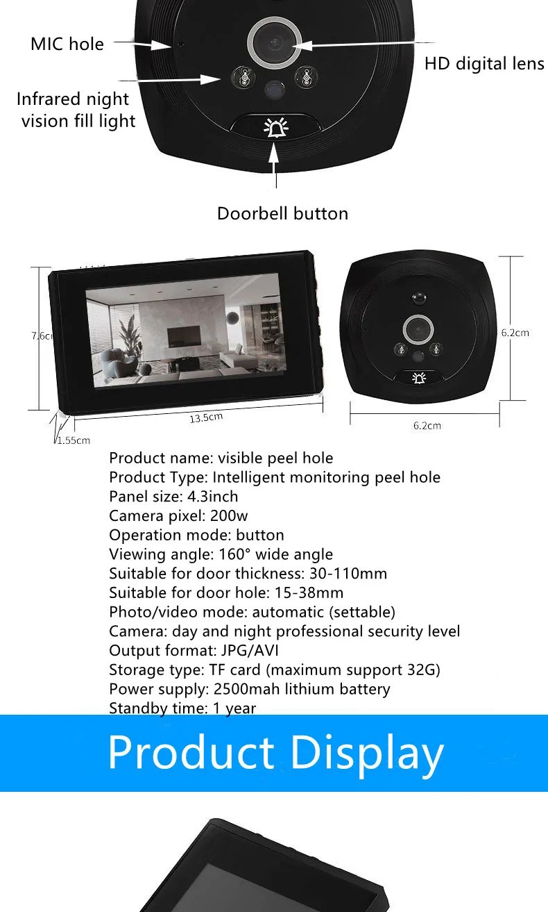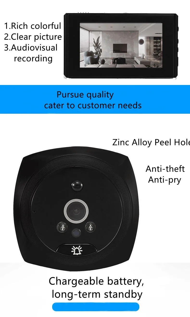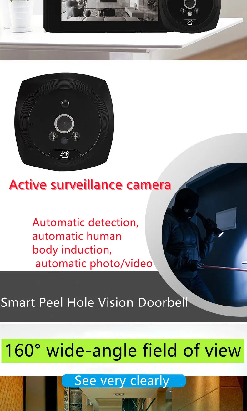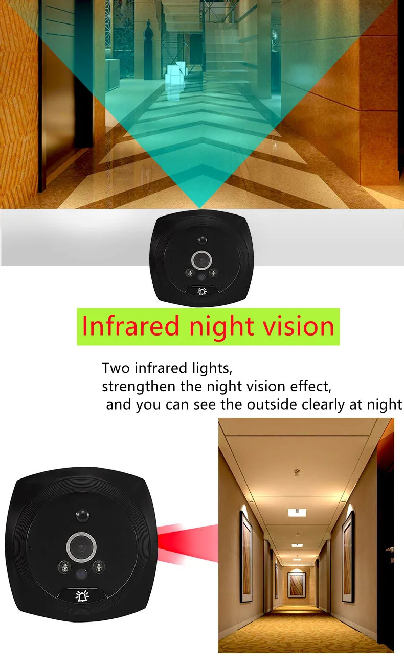 1. The visible peephole outside the door can record and take photos. It can also be used as a doorbell. With night vision