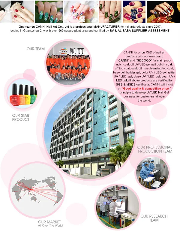 Guangzhou CANNI Nail Art Co., Ltd is a professional MANUFACTURER for nail art products since 2007. CANNI factory locates in Guangzhou City with over 900 square plant area and certified by BV & ALIBABA SUPPLIER ASSESSMENT, we approved new GMP standard workshop in 2017. CANNI focus on R&D of nail art products with our own brand “CANNI” / “GDCOCO” and "VENALISA" for main products: Primer, Base Coat,Topcoat, Chameleon/Cat Eye Gel Polish, Painting Gel, Extending Nail Builder Gel, 3D gel etc. All products are provided MSDS/ SGS/ REACH/ CPNP certificate. CANNI company will insist on principle of "Good quality and competitive price" and support more customers with good service and products!
