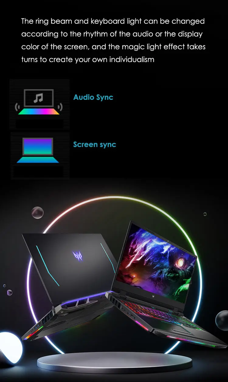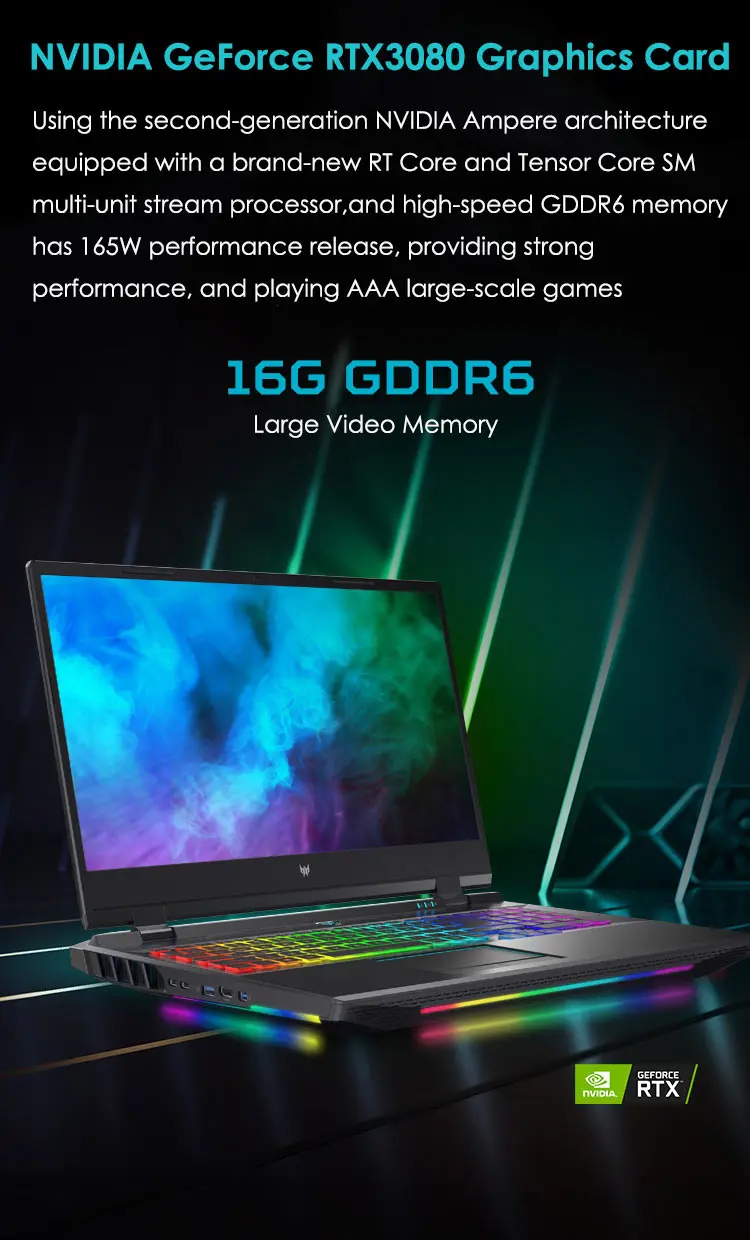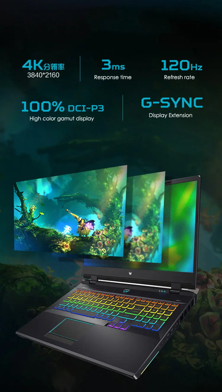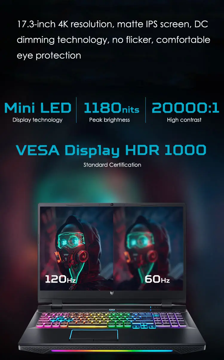 Screen Mini LED Display technology,17.3" 4K 120Hz 3ms UHD IPS gaming screen,16:9,3840x2160,1180 nits peak brightness,100% DCI-P3 high color gamut,support G-SYNC(Display extension),Contrast 20000:1,DC dimming,No flicker