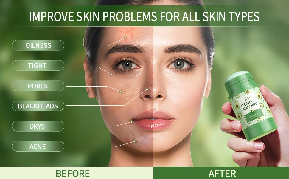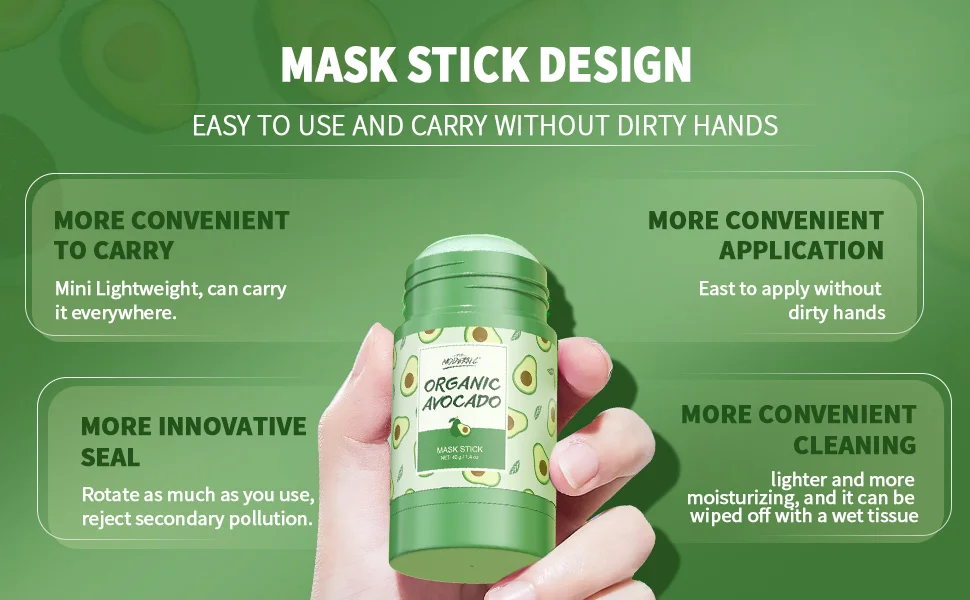 The unique formula of our Avocado Purifying Clay Stick Mask is supercharged with a high concentration of active and natural ingredients Which can deeply cleanses, reduce blackheads, improve facial dullness and nourishes the skin, what will give you a chance to spend a moment with yourself.