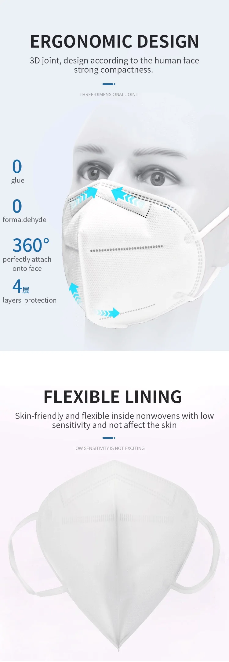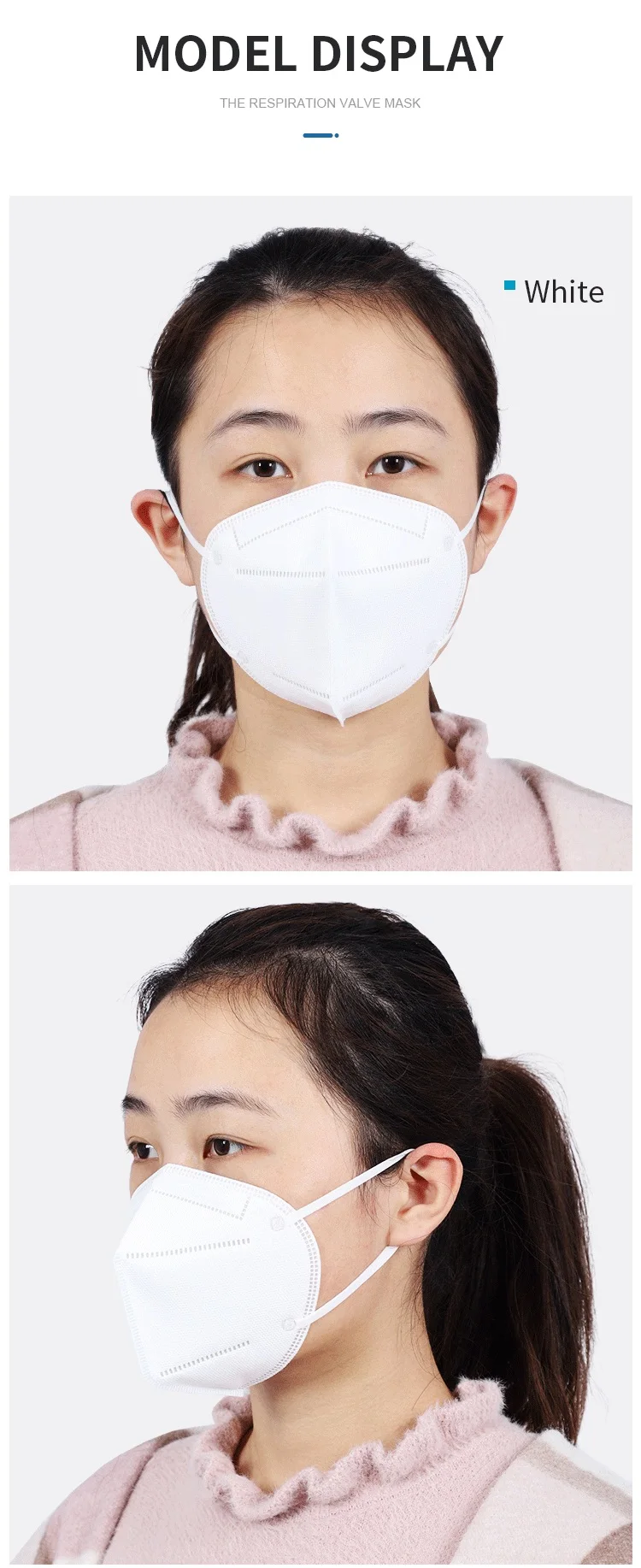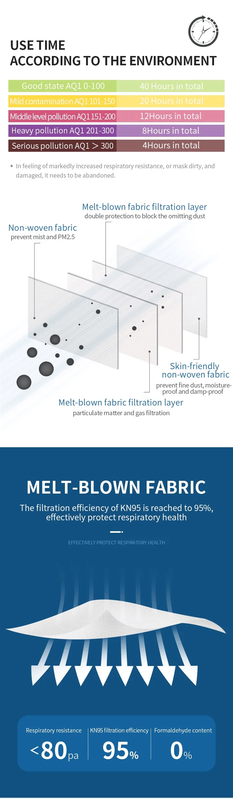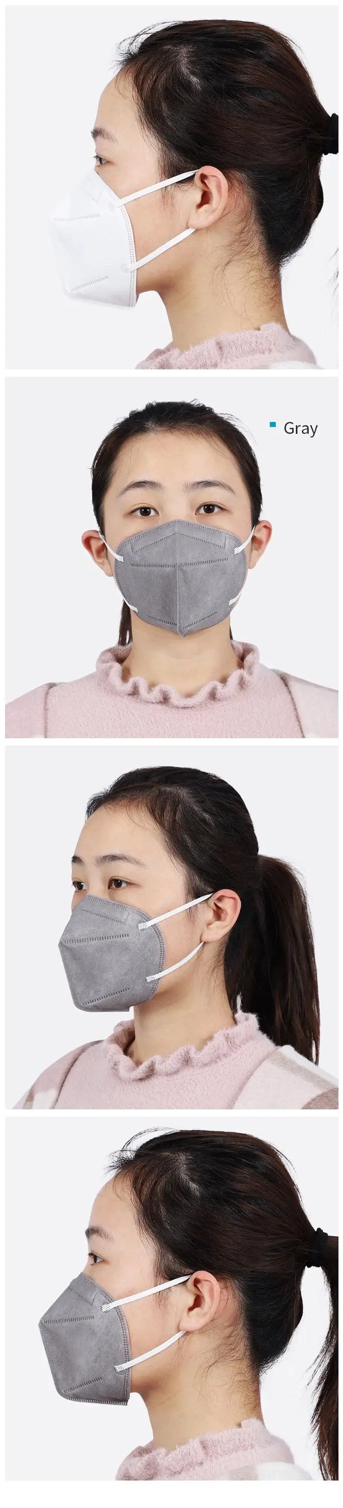 The outer layer and inner layer are made of polypropylene spunbond non-woven fabric, the fifilter layer is made of polypropylene melt-blown non-woven fabric. The Nose clip is made of adjustable metal strip and ear loop is made of knitted nylon.