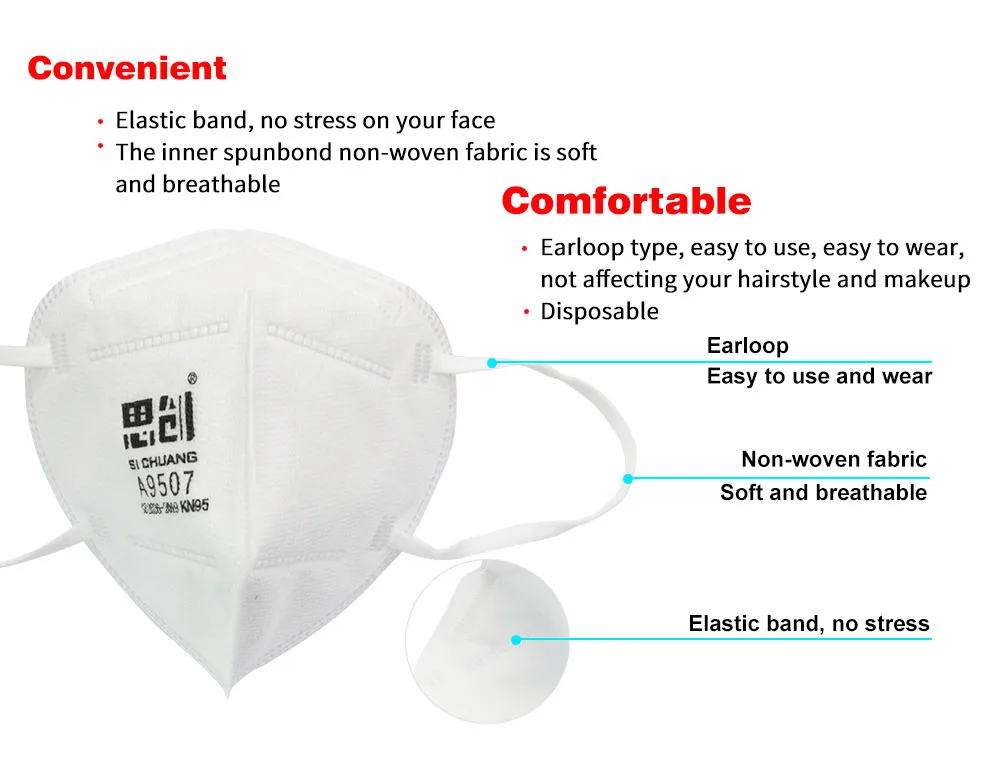 3. Disposable, Earloop type, easy to wear, not affecting your hairstyle and makeup.