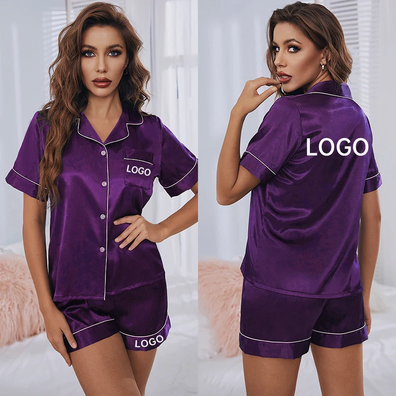 Factory Custom Women Pajamas Short Sleeve Candy Color 2 Piece Satin Pajamas Sets