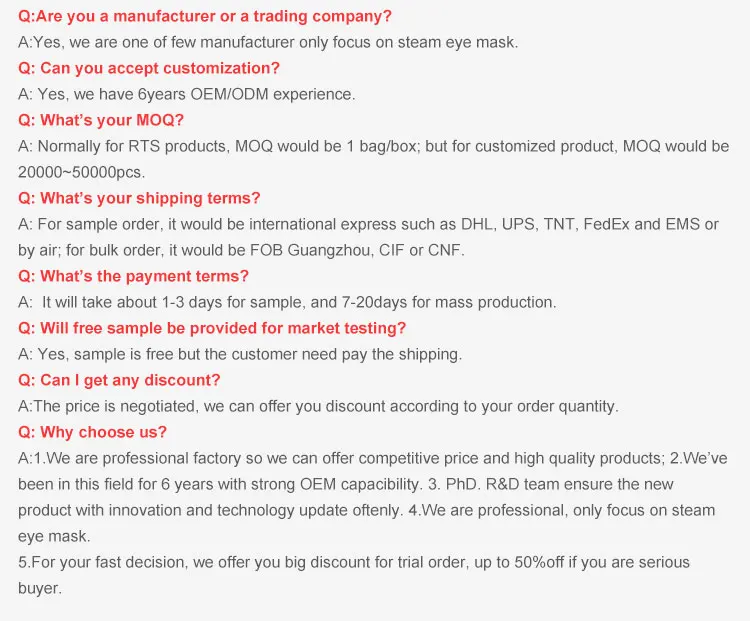 Focus on OEM/ODM business for 6years in this field, the first factory only concentrated in steam eye mask in China.
