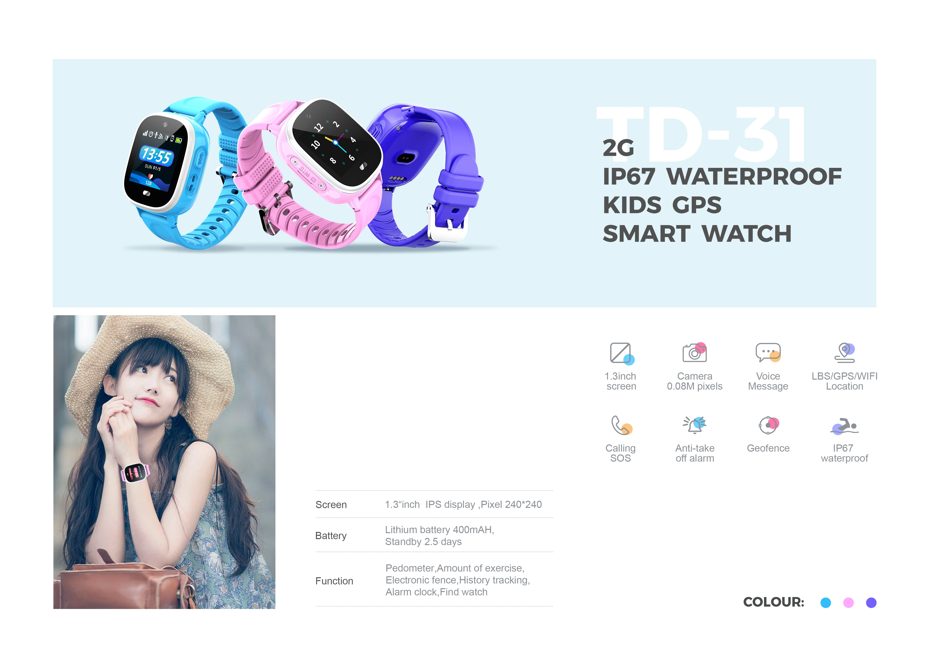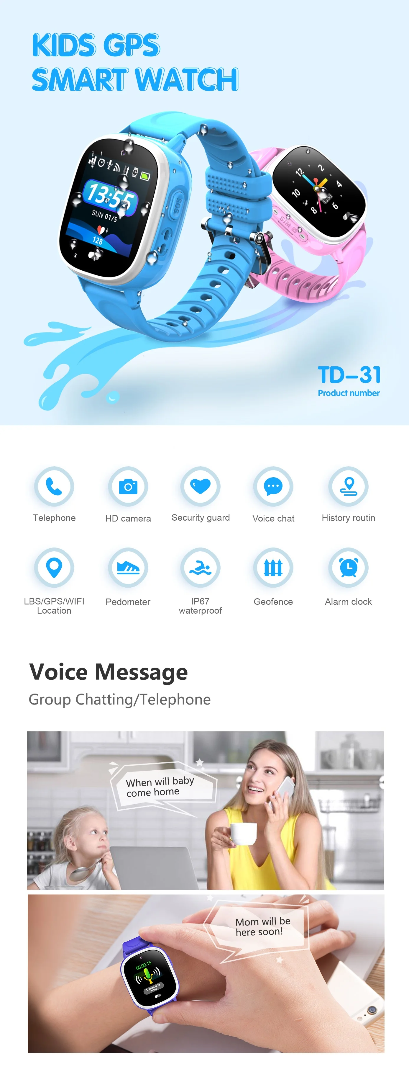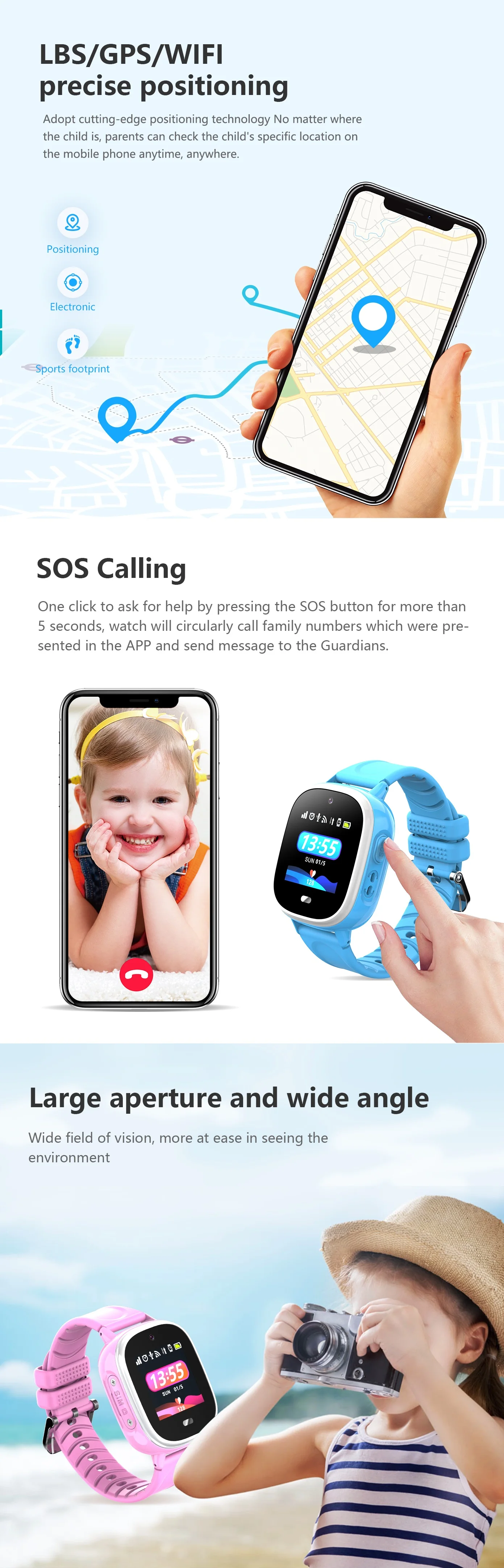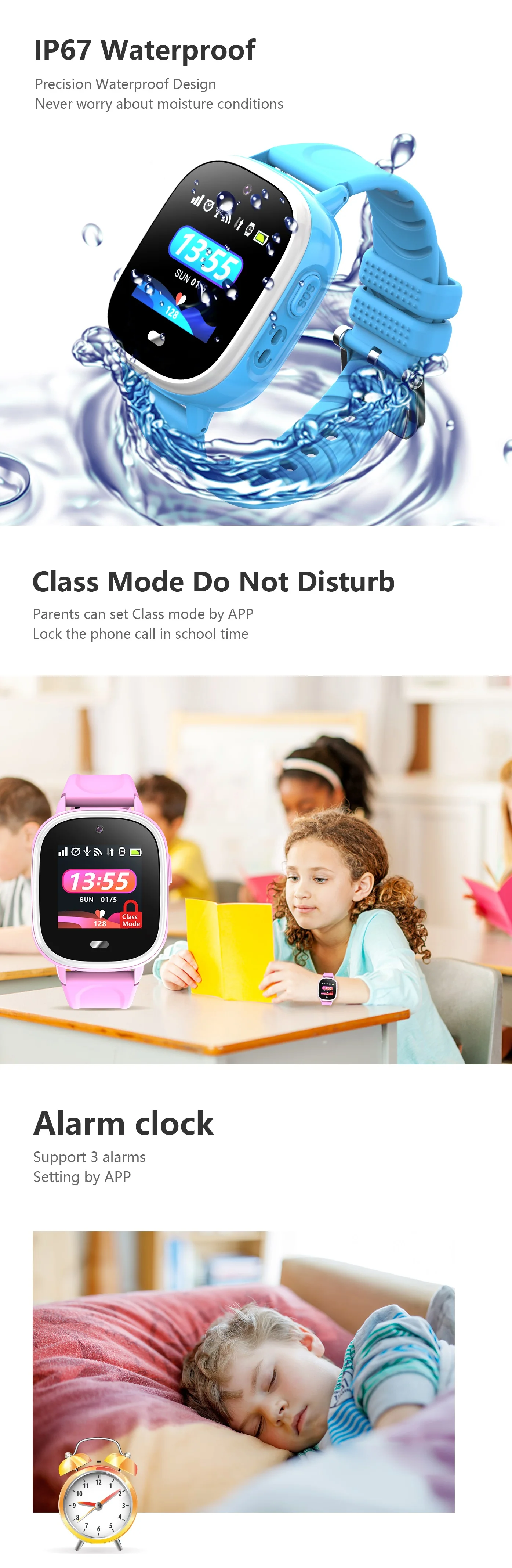 Electronic fence (GEO),History tracking,Alarm clock,Find watch , phone book, working mode, Remote shutdown watch, support APP for