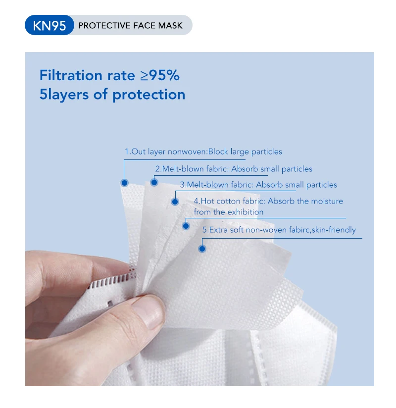 Materials | 1st & 5th layer: PP non woven 2nd & 3rd layer: Melt blown non woven 4th layer: Hot air cotton fabric |