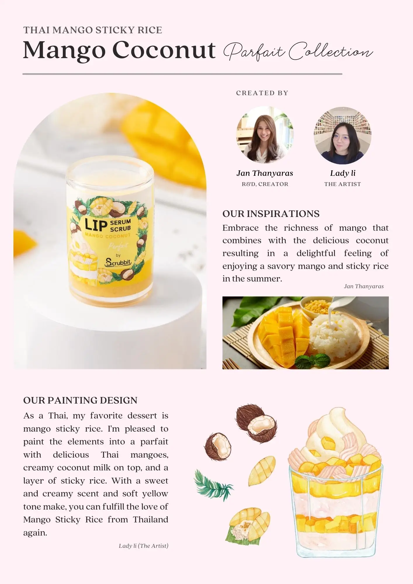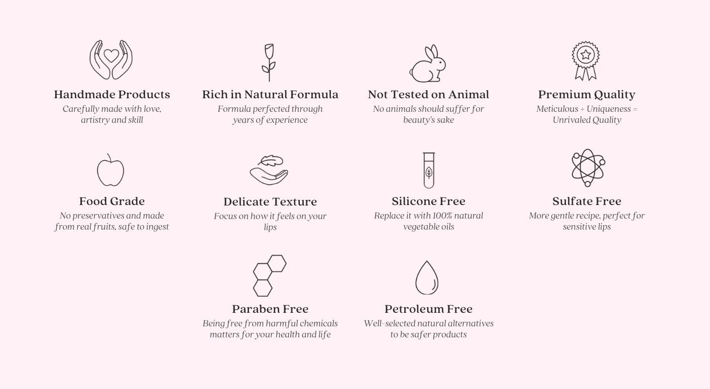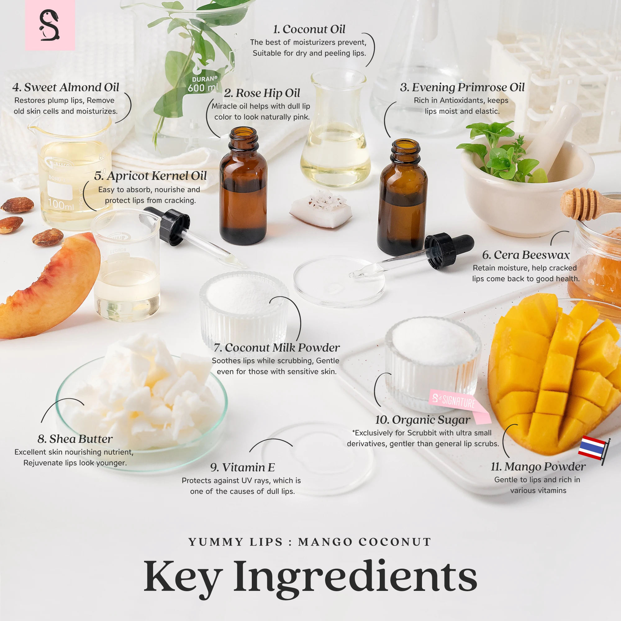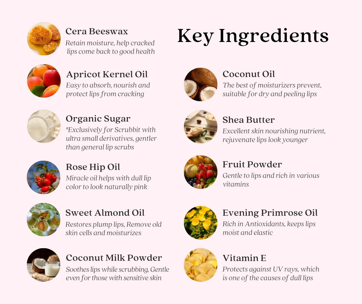 Ingredient | Rose Hip Oil, Evening Primrose Oil, Apricot Kernel Oil, Sweet Almond Oil, Coconut Oil, Shea Butter, Cetyl Alcohol, Cera Alba, Polyglyceryl-3 Beeswax, Stearic Acid, Tocopheryl Acetate (Vitamin E), Flavor Oil, Mineral Pigment, Lip Scrub: The same ingredients as above in addition to Organic Sugar, Coconut Milk Powder, Mango Powder |