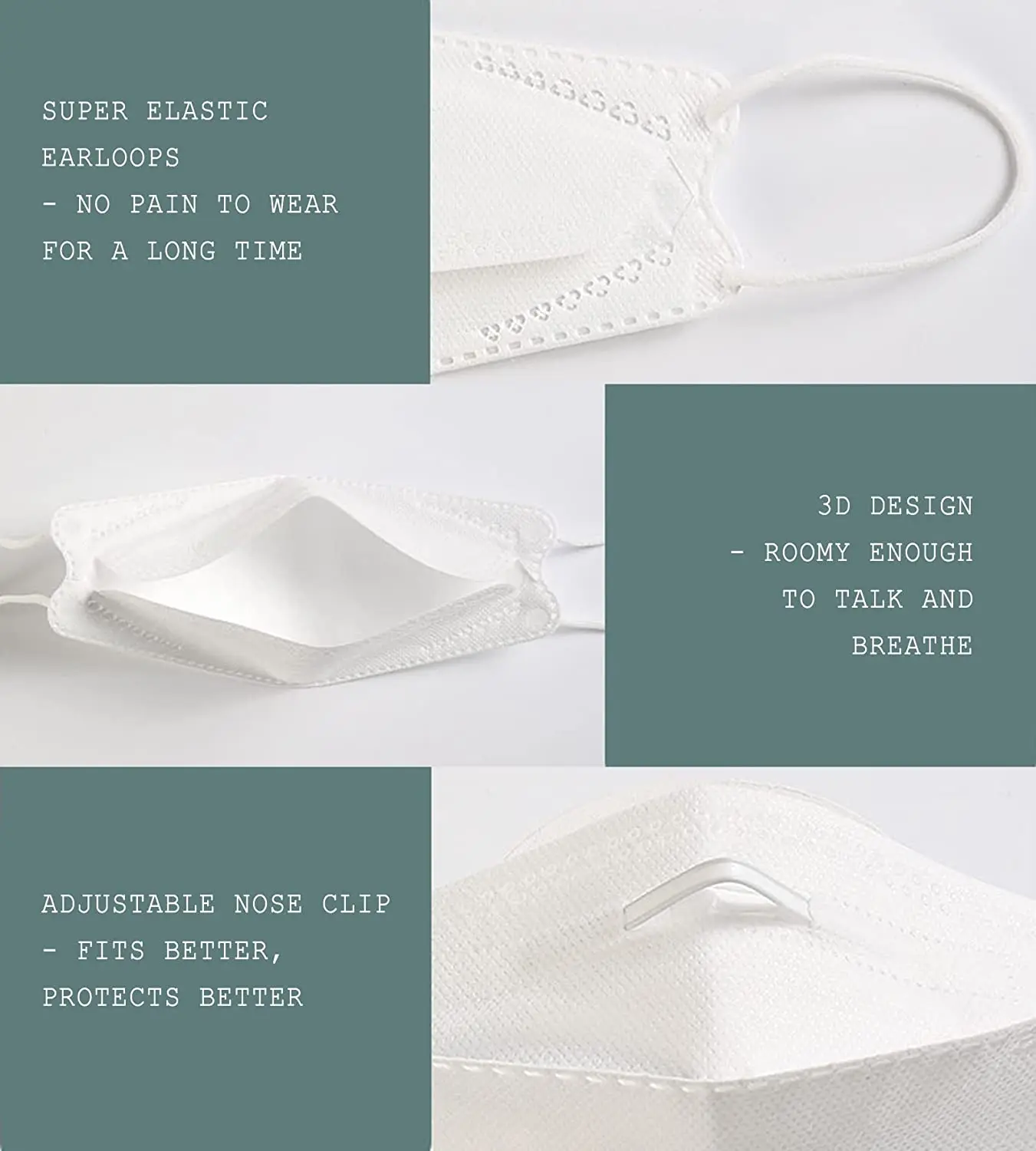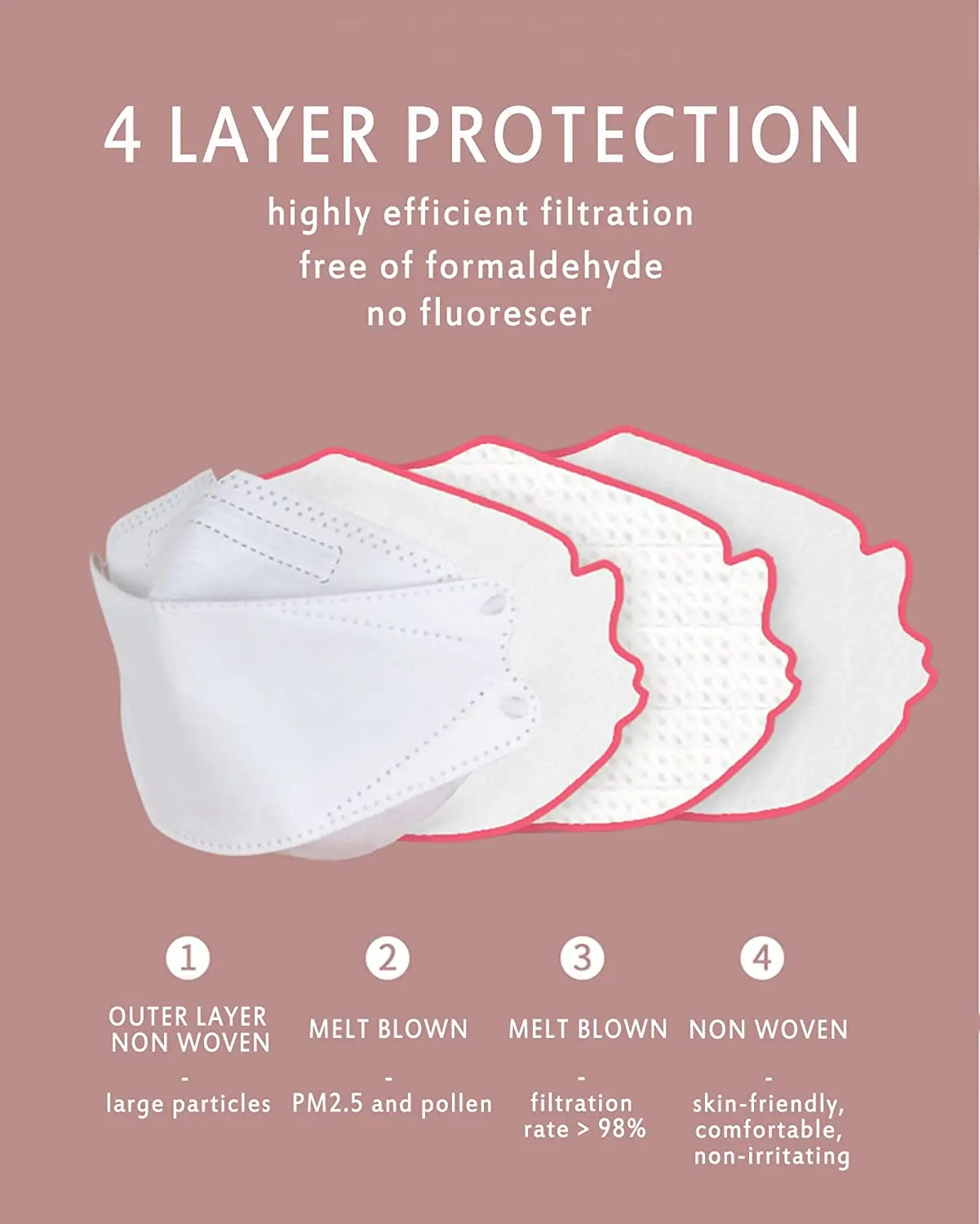 | Feature | High filtration efficiency, Low breathing resistance, Soft and comfortable |