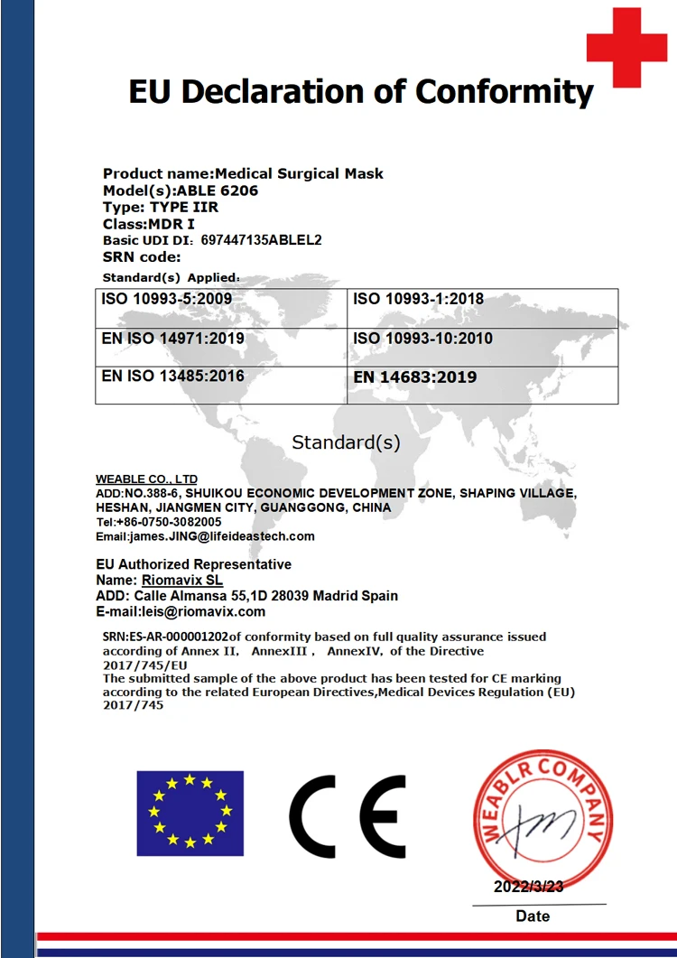 | Certificate | CE EN14683, USA 510(k), MDR(EU)2017/745 |