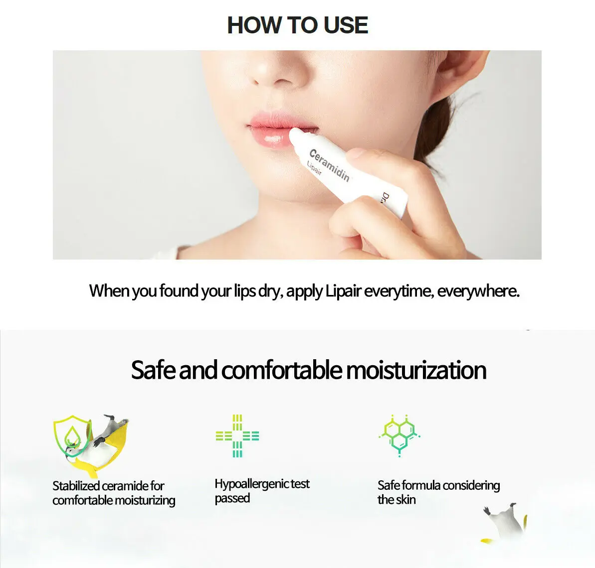 The innovative Ceramidin Lipair applicator fits perfectly with the lip line for a seamless application. A quick swipe of this light, non-sticky lip treatment on dry, chapped lips will have you practicing the French double-cheek kiss with everyone you meet.