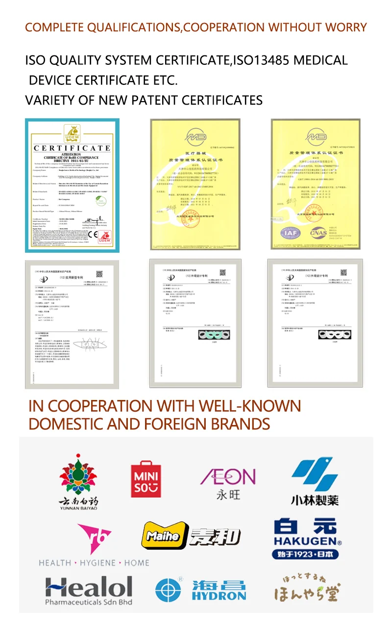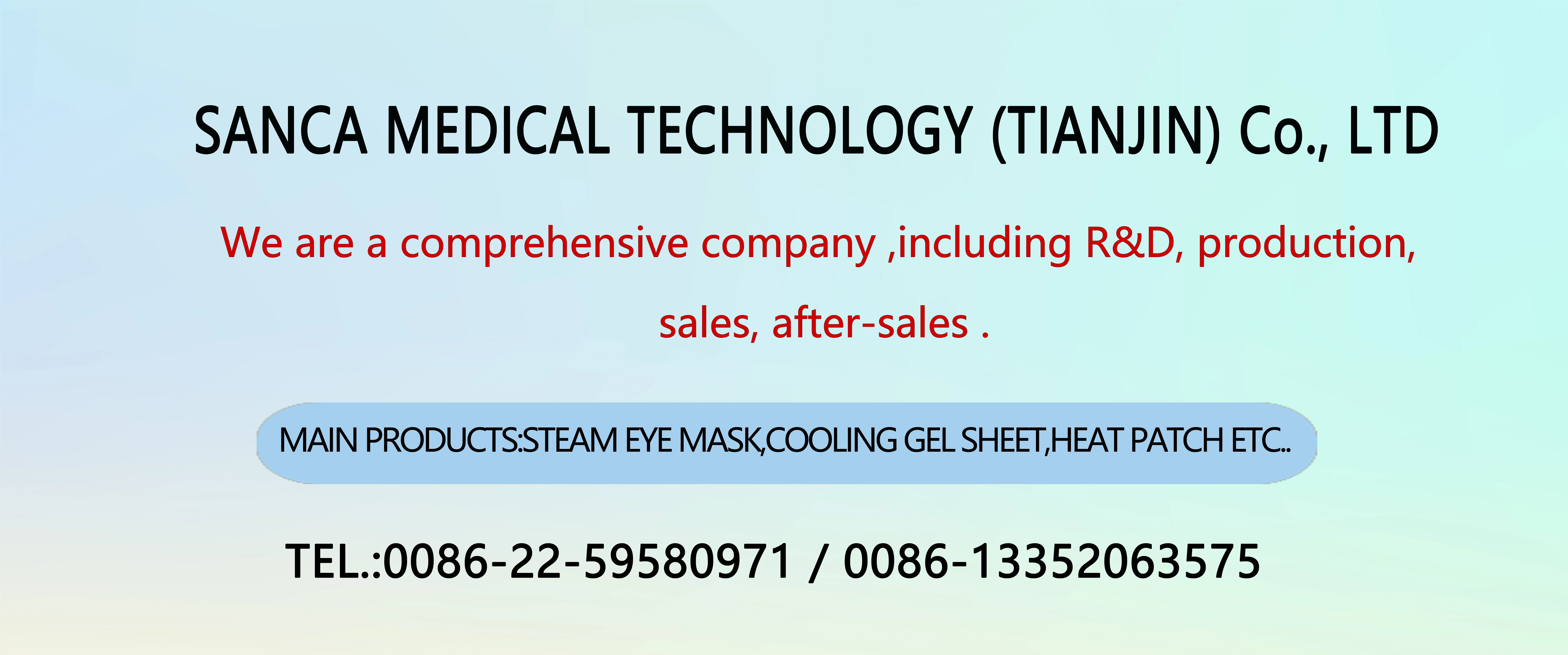 Our company was founded in 1998, specializing in the field of hot and cold compress for 20 years. We are a high-tech enterprise, set research , production, sales as a whole, obtained a number of utility patent certificate and appearance patent certificate.Our factory has got ISO-9001, ISO-13485 management system certificate, and our products have European CE and other third-partyinternational certification. Adhering to the enterprise development philosophy of "professional, efficient, inclusive and win-win", our partners include Yunnan Baiyao, Aeon, Kobayashi, Reckitt Benckiser, Miniso and many other well-known brands. Sanca's technology and products provide professional services to consumers. Hot compress products include: warming eye mask, heat patch, hand warmer etc.. Cold compress products include: cooling eye mask, cooling gel sheet, antipyretic patch and other products. We look forward to your inquiry.