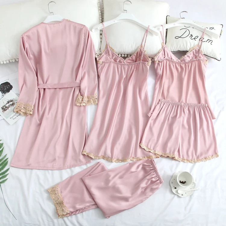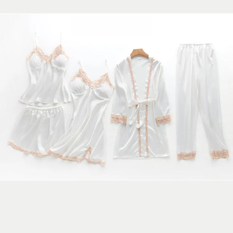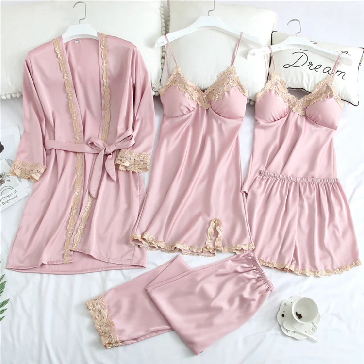 New Pijama Women Silk Pajamas Se Lounge Pyjama with Chest Pads 5 Pieces Sets Satin Sleepwear Silk Embroidery Night Suit Wear