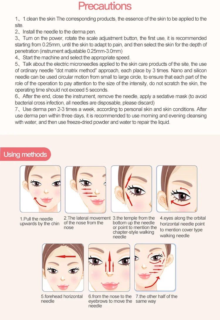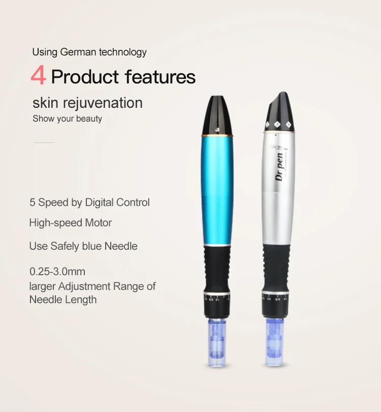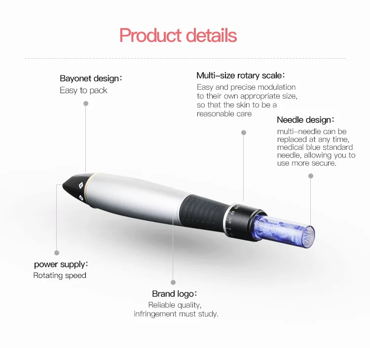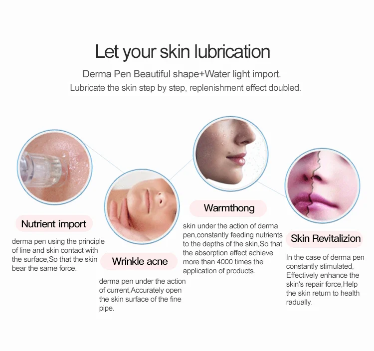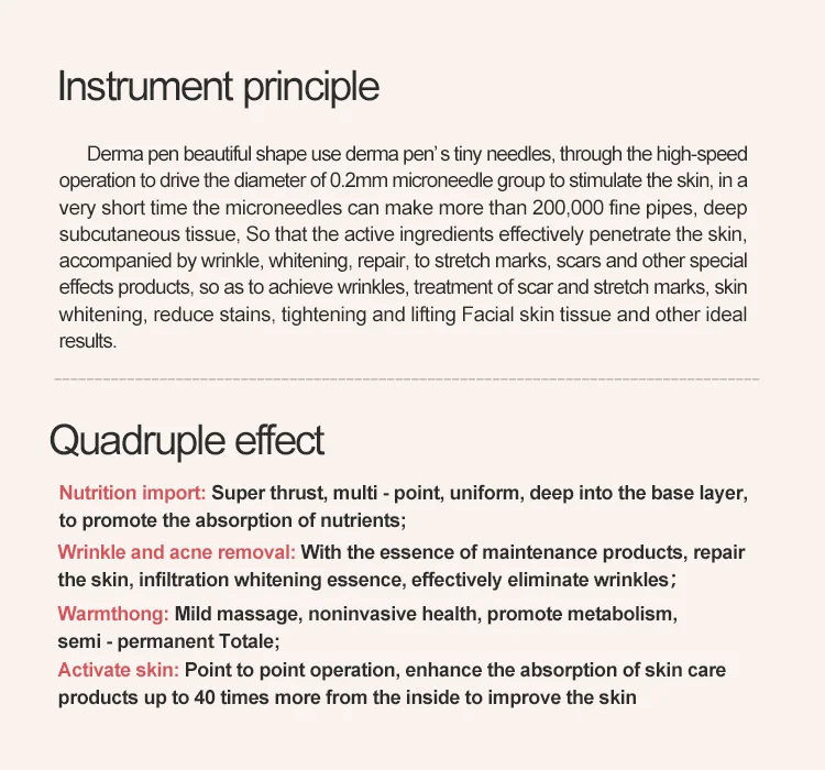 Derma pen, in a beautiful shape, uses microneedles which can stimulate the skin through high-speed operation to make more than 200,000 fine tubes deep into the subcutaneous tissue in a very short time. It can effectively penetrate the active ingredients into the skin, with beauty special effects products, to achieve anti-wrinkle, treatment of scar and stretch marks, skin whitening, reduce stains, tightening and lifting facial skin tissue and other ideal results.