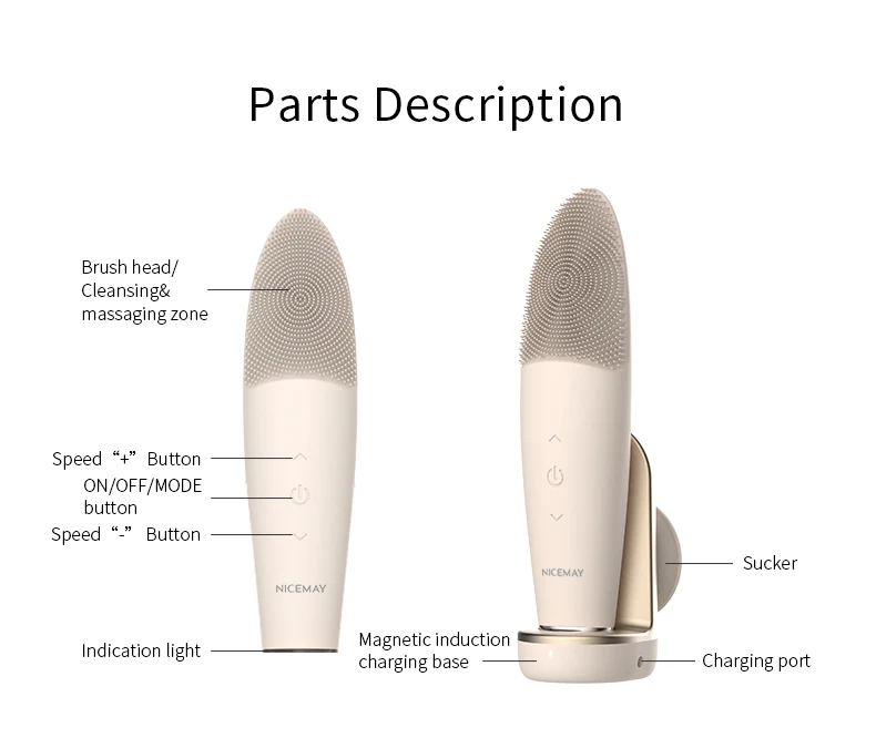Advantages: 1. Magnetic induction charging base, strong sucker, absorbed device on the wall when not use; 2. Brush head in 30° flexible design , perfect for face contour, Move flexibly like finger; 3. 12 circles pattern, generate foam quickly; 4.0.6mm ultra thin silicone pins; 5. 55℃thermal technology; massage and increase blood circulation 6. 8 strengths for each mode; 7.High frequency and CVT frequency vibration, easy for T-zone care, effectively removes stubborn horn and dirt. Specification Product size: 41.5*34.5*155.5mm Materials: Silicone+ABS Product N.G.: 97g Color: Green Power: Inductive base Waterproof: IPX7 Battery: 1000mAH