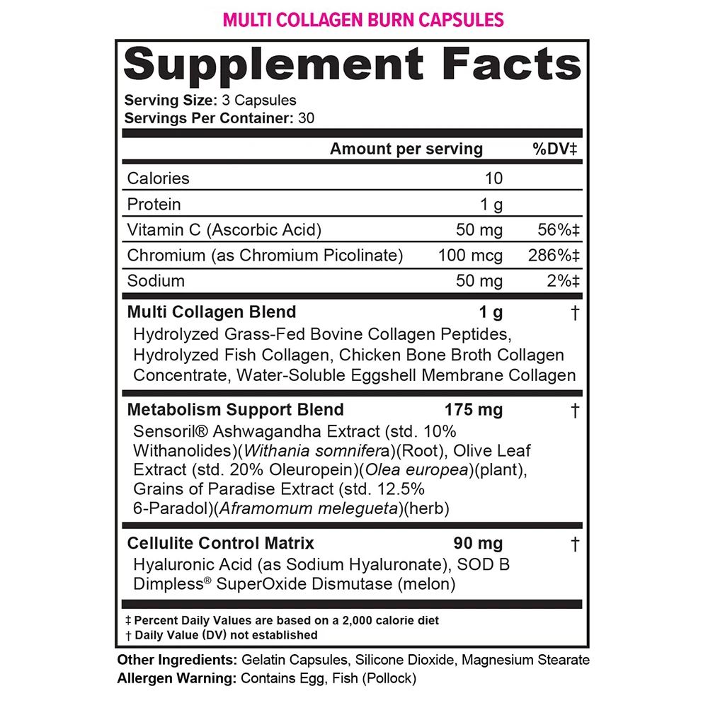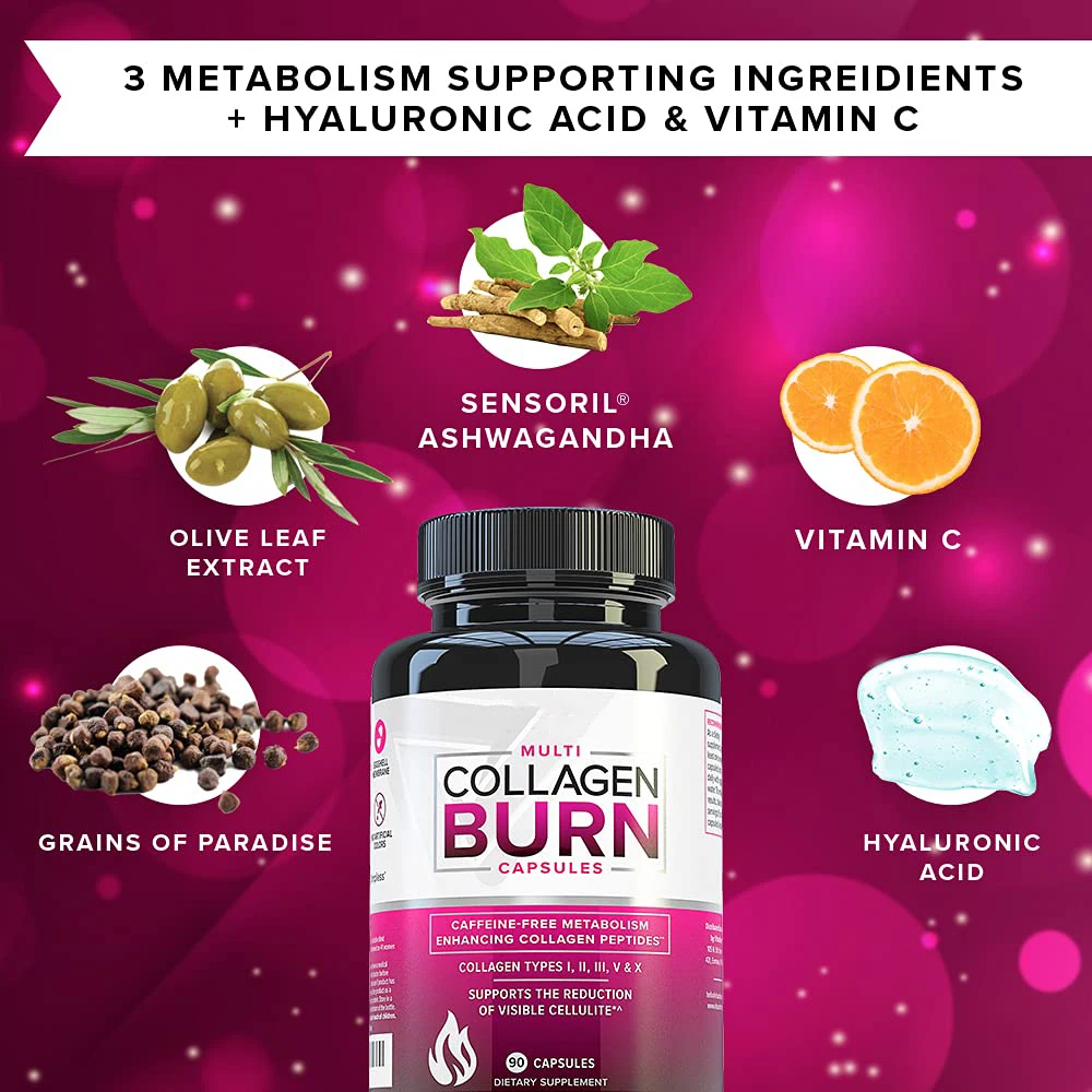 - 5 TYPES OF COLLAGEN - Each serving contains Types I, II, III, V and X Collagen plus Hyaluronic Acid & Vitamin C and other added thermogenic ingredients such as Grains of Paradise and Sensoril Ashwagandha for caffeine-free metabolism support. - 4 ALL-NATURAL SOURCES - Sustainably sourced Grass-fed bovine beef, farm-raised chicken, wild caught marine and eggshell. - GLOWING SKIN - Types I, III & V Collagen have been shown to help reduce cellulite and wrinkles while supporting skin elasticity and hydration. - JOINT AND BONE HEALTH - Types II & X Collagen support bones, tendons and connective tissue for healthier, pain free joints.