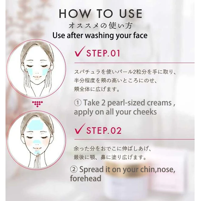 Ingredients | Water, Glycerin, Isopentyldiol, Caprylic/Capric Triglyceride, BG, Cetearyl Alcohol, Niacinamide, Dimethicone, Glyceryl Stearate(SE), 1,2-Hexanediol, PEG-40 Stearate, (Ammonium Acryloyldimethyltaurate/VP) Copolymer, Cetearyl Glucoside, Phenoxyethanol,t-Butyl Alcohol, Sodium Hyaluronate, Dipotassium Glycyrrhizate, Soluble Proteoglycan, Prunus Yedoensis Leaf Extract, Paeonia Albiflora Root Extract, Angelica Acutiloba Root Extract, Lycium Chinense Fruit Extract, Coix Lacryma-Jobi Ma-yuen Seed Extract,Prunus Lannesiana Flower Extract, Panax Ginseng Root Extract, Carbomer, Polysorbate 20, Palmitoyl Tripeptide-1, Palmitoyl Tetrapeptide-7, Sodium Lactate, Fragrance |