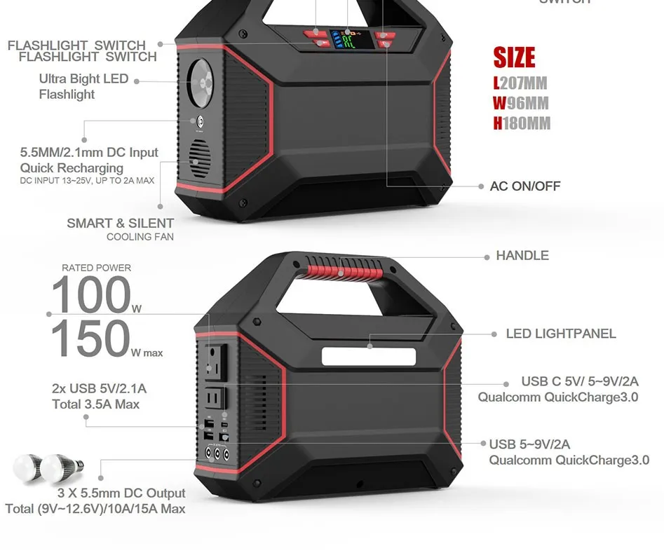 DC Output | 2 x USB 5V-2.1A Total:3.5A Max 1 x USB 5~9V/2A Qualcomm QuickCharge3.0 1 x USB C 5~9V/2A Qualcomm QuickCharge3.0 3 x 5.5MM DC Output: 9~12.6V/10A(15A Max Total) |