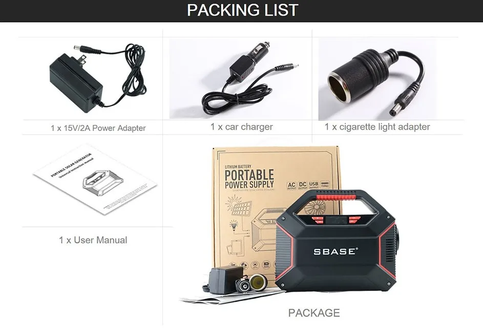 Package include: | 1 x Portable Power Supply 1 x 15V/2A Power Adapter 1 x Car Charger 1 x Cigarette Lighter Adapter 1 x user manual. |