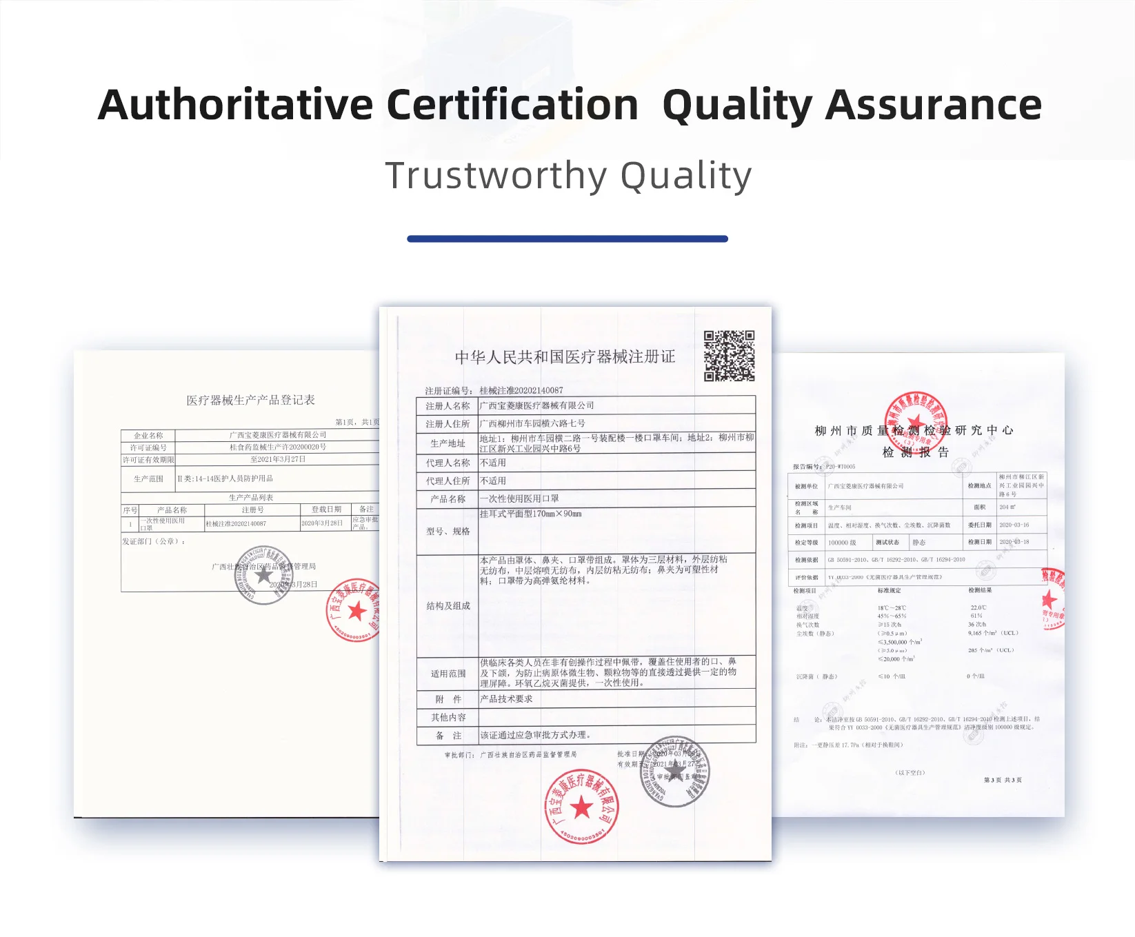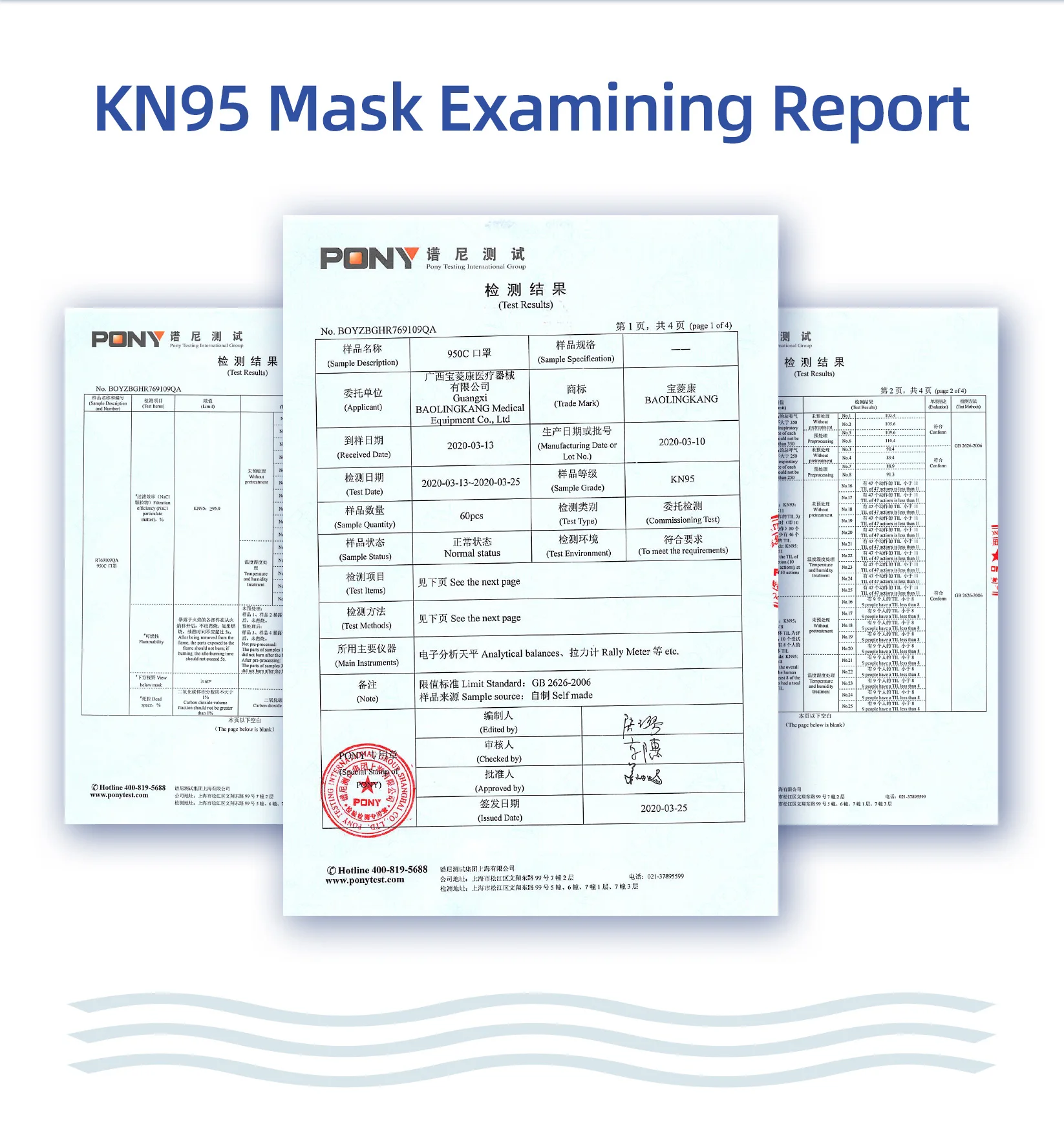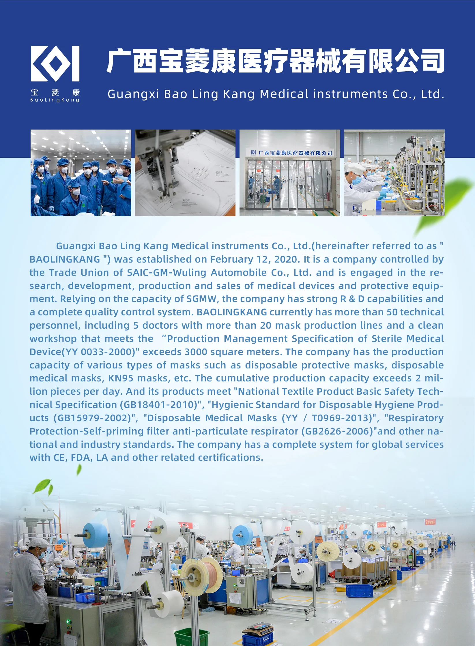 Guangxi Bao Ling Kang Medical instruments Co., Ltd.(hereinafter referred to as " BAOLINGKANG ") was established on February 12, 2020. It is a company controlled by the Trade Union of SAIC-GM-Wuling Automobile Co., Ltd. and is engaged in the research, development, production and sales of medical devices and protective equipment. Relying on the capacity of SGMW, the company has strong R & D capabilities and a complete quality control system. BAOLINGKANG currently has more than 50 technical personnel, including 5 doctors with more than 20 mask production lines and a clean workshop that meets the "Production Management Specification of Sterile Medical Device(YY 0033-2000)" exceeds 3000 square meters. The company has the production capacity of various types of masks such as disposable protective masks, disposable medical masks, KN95 masks, etc. The cumulative production capacity exceeds 2 million pieces per day. And its products meet "National Textile Product Basic Safety Technical Specification (GB18401-2010)", "Hygienic Standard for Disposable Hygiene Products (GB15979-2002)", "Disposable Medical Masks (YY / T0969-2013)", "Respiratory Protection-Self-priming filter anti-particulate respirator (GB2626-2006)"and other national and industry standards. The company has a complete system for global services with CE, LA and other related certifications.
