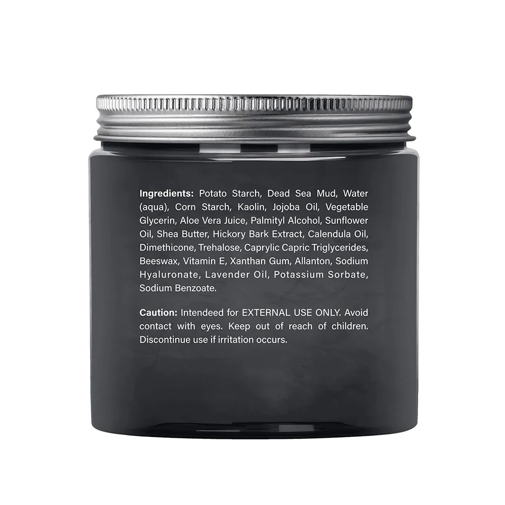 | Ingredients | Potato Starch, Dead Sea Mud, Water (aqua), Corn Starch, Kaolin, Jojoba Oil, Vegetable Glycerin, Aloe Vera Juice, Palmityl Alcohol, Sunflower Oil, Shea Butter, Hickory Bark Extract, Calendula Oil, Dimethicone, Trehalose, Caprylic Capric Triglycerides, Beeswax, Vitamin E, Xanthan Gum, Allanton, Sodium Hyaluronate, Lavender Oil, Potassium Sorbate, Sodium Benzoate. |