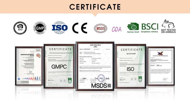 A: ISO22716, GMPC, RSPO, COA, CE, MSDS and so on.