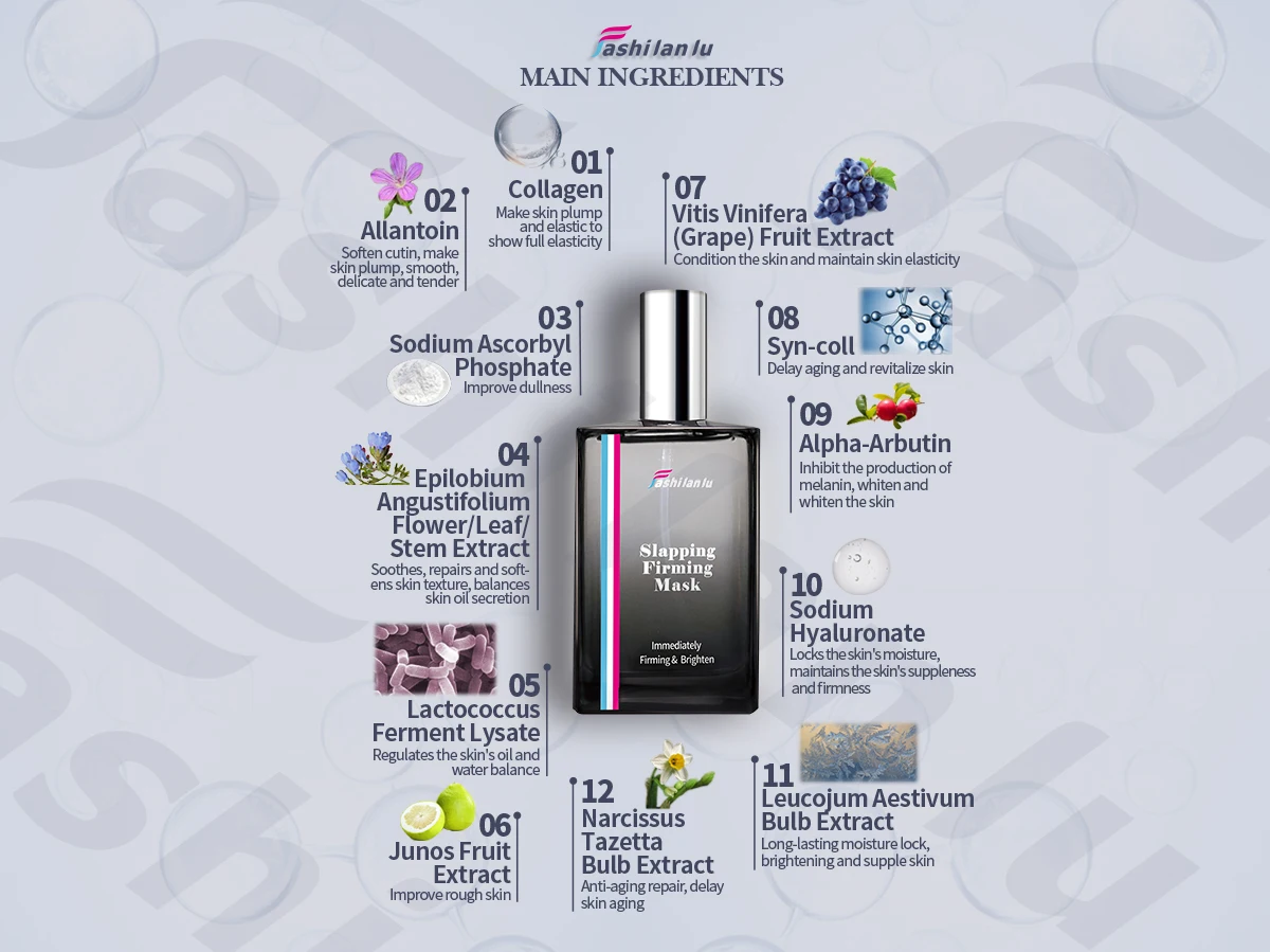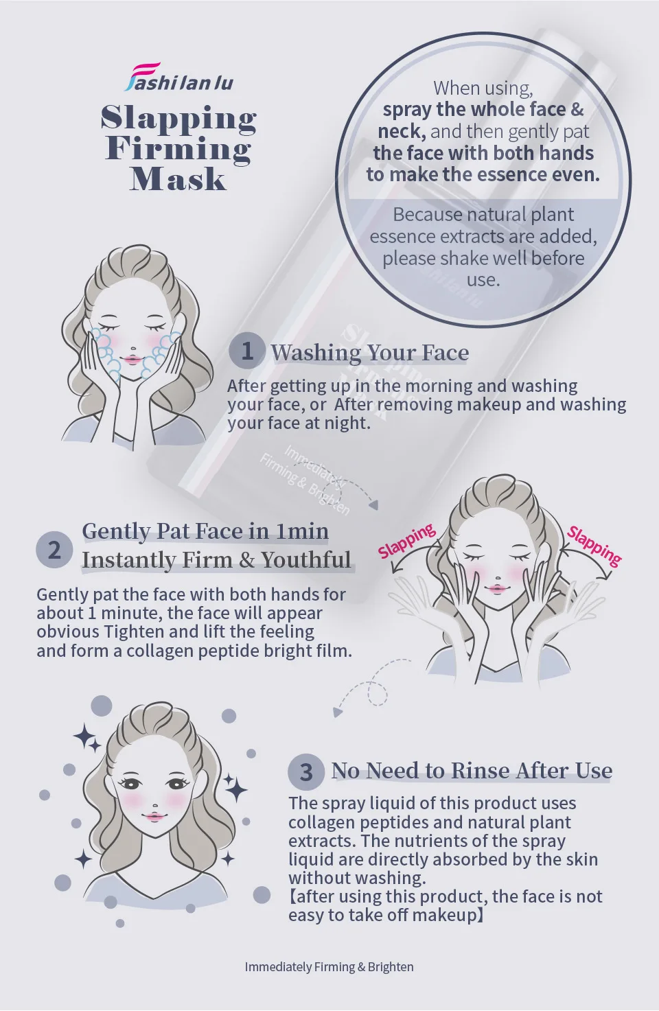 4. The spray liquid of "Fashilan Lu -Slapping Firming Mask" is made by collagen peptide and natural plant extract essence can be directly absorbed by the skin, so do’nt need to rinse wash.