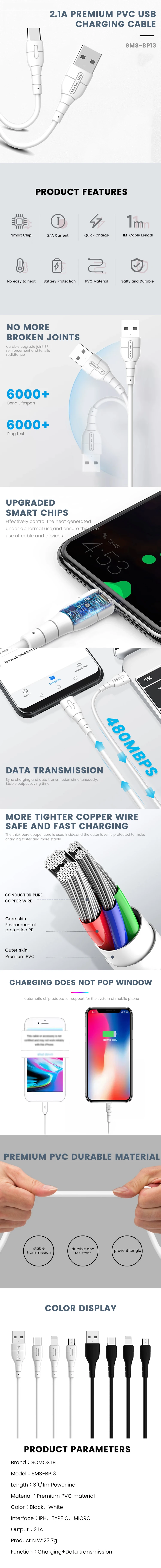Somostel fast micro charging cable usb para celular for cell phone premium PVC usb type c data cable cargador for iphone android