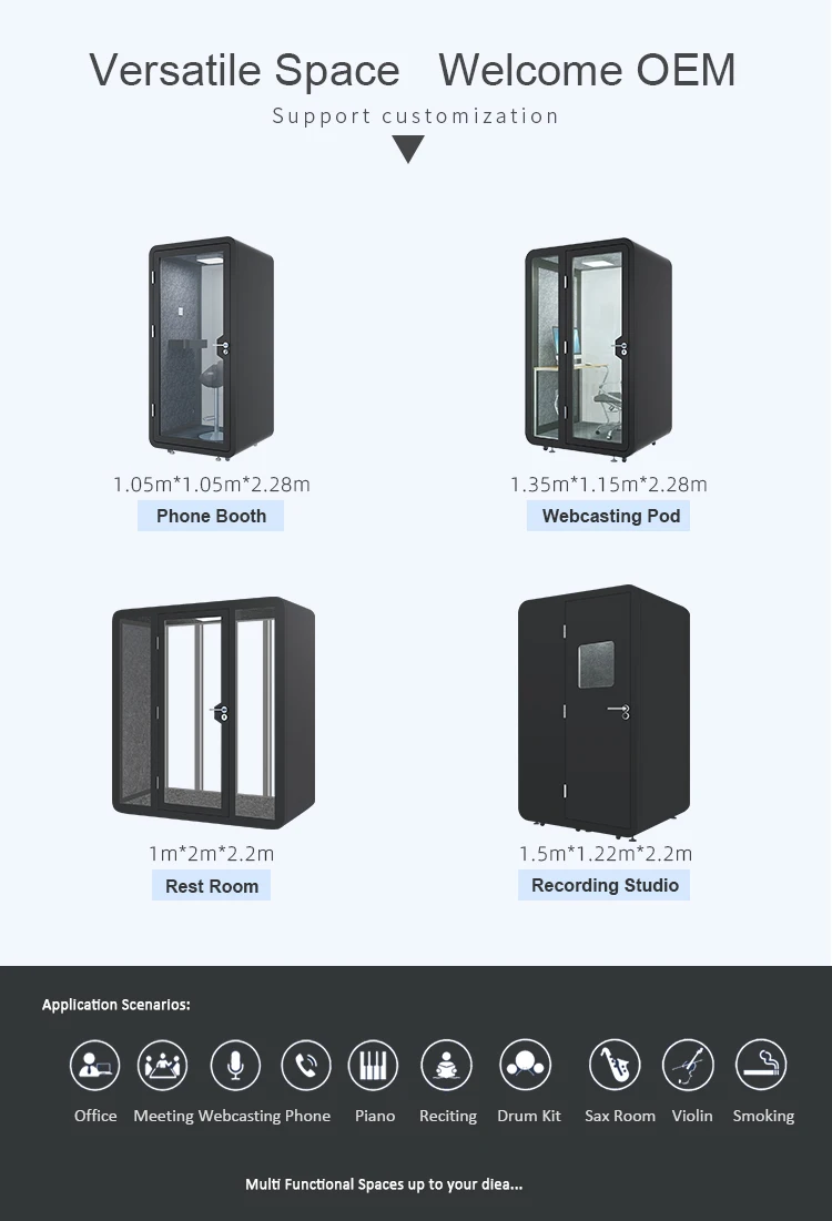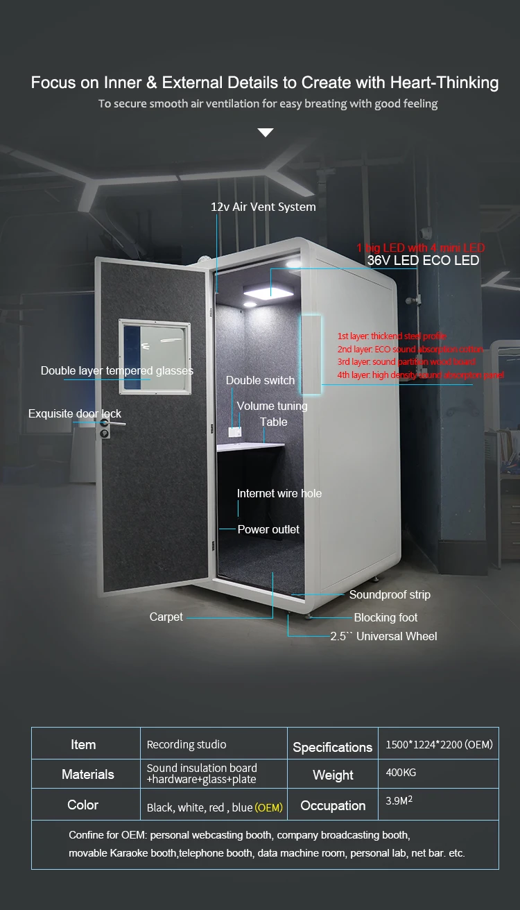 Guangzhou Xindehe Electronic Factory is specialized in manufacturing soundproof booths for over 20 years, incorporating design, research, development, molding, hardware processing, assembling, sales as a whole. The products include soundproof booths, mini KTV room, mini webcast room,etc, The factory covers an area of 3000 square meters, with about 100 employees and several patents,and offer OEM, amusement site design and management service, to meet demands on quality, technology, functions and styles. Our products are popular all over the world, seeing is better than listening, welcome customers and friends to visit our factory for negotiations!