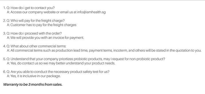 | Certificate | -Certified QPS and GRAS -Tested by HSA-accredited laboratory -Manufactured in GMP approved laboratory -Non-GMO, vegetarian-friendly, dairy-free, gluten-free, non-allergenic |