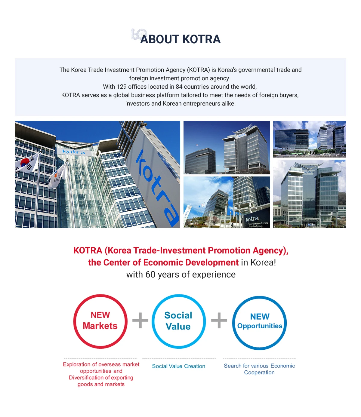 The Korea Trade-Investment Promotion Agency (KOTRA) is Korea's governmental trade and foreign investment promotion agency.With 129 offices located in 84 countries around the world, KOTRA serves as a global business platform tailored to meet the needs of foreign buyers, investors and Korean entrepreneurs alike.