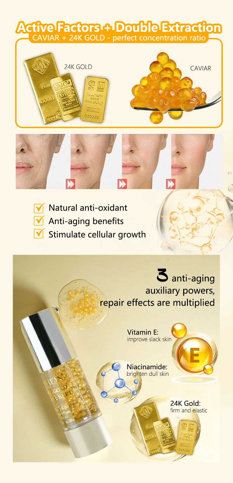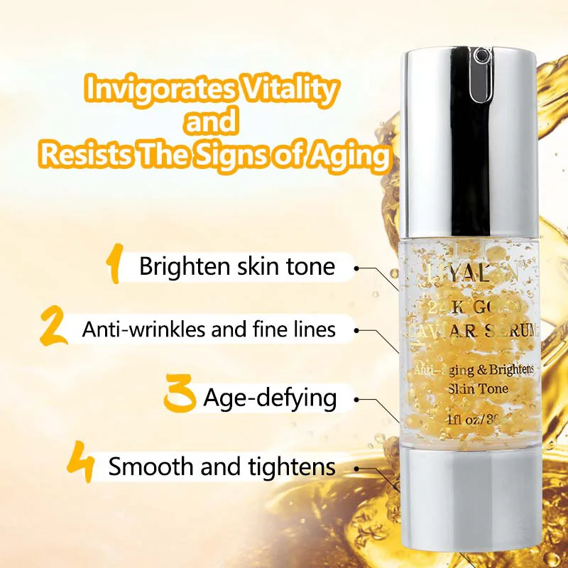 Product Name | Wholesale Face Care Organic Whitening Moisturizing Anti Aging Vitamin E Nicotinamide Facial 24k Gold Caviar Serum |