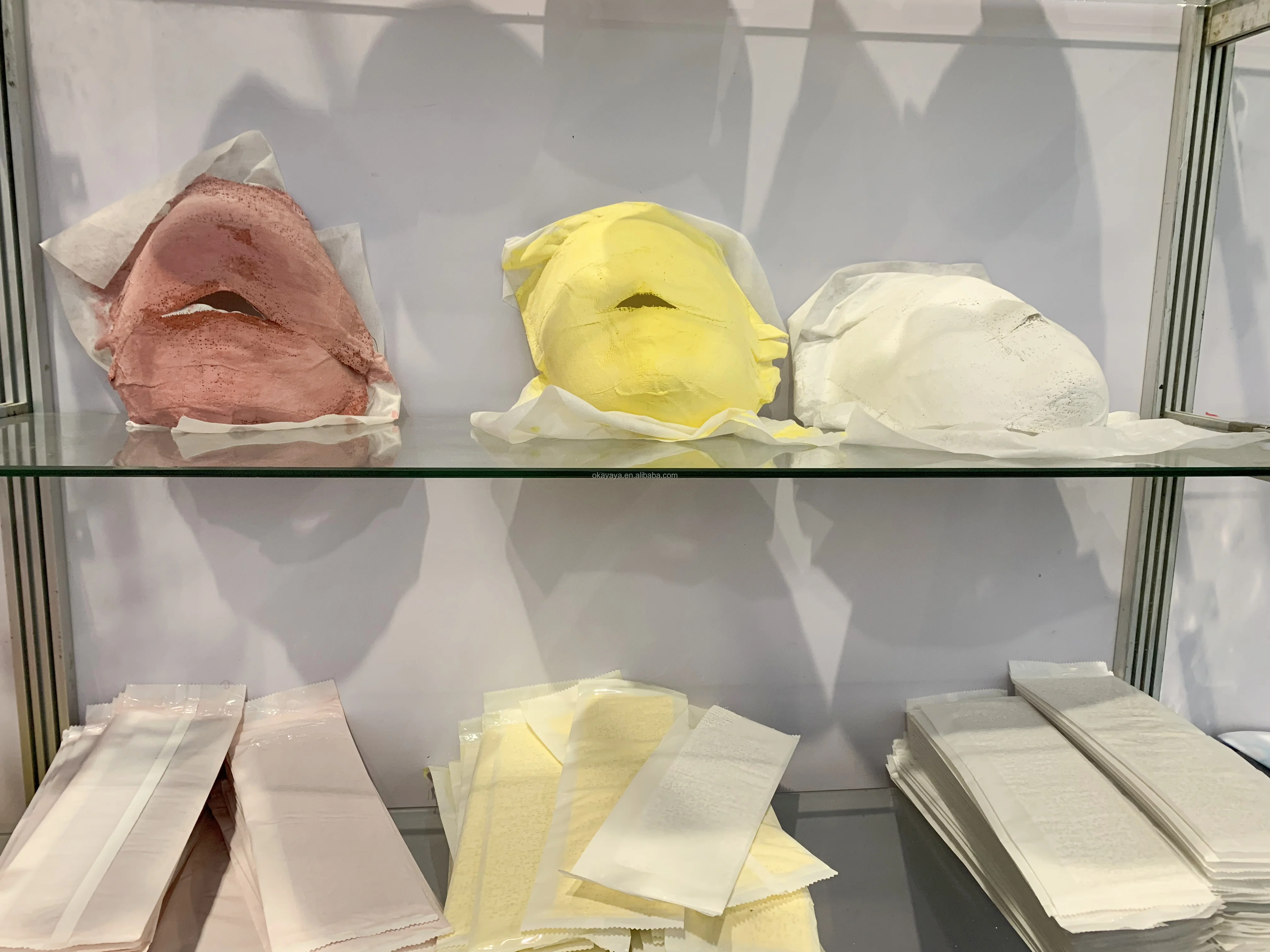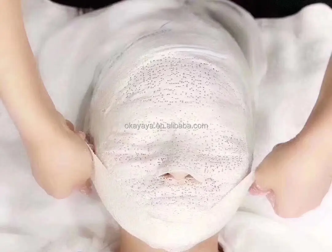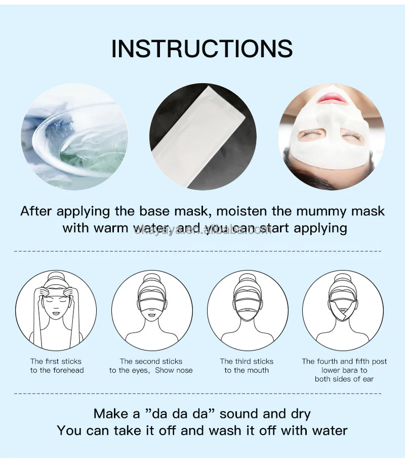 It is not actual plaster mask even main ingredient is medical plaster. Original mask is some fiber belt, with many beauty icon such as aloe vera powder. After it wet and apply to clients’ face, wait for 20-30 minutes the medical plaster concreting and building firm stucture as lifting shape. During this period skin collagen regenerating build as lifting gesture to reach treatment improvement.