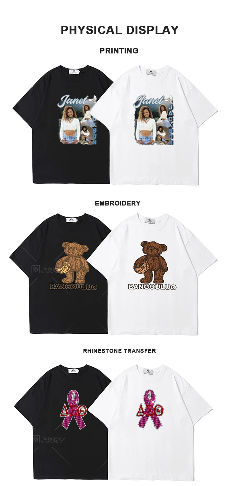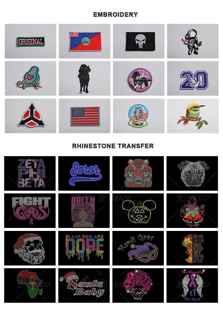 Technology: | Rhinestone, Heat transfer printing,Embroidery. |