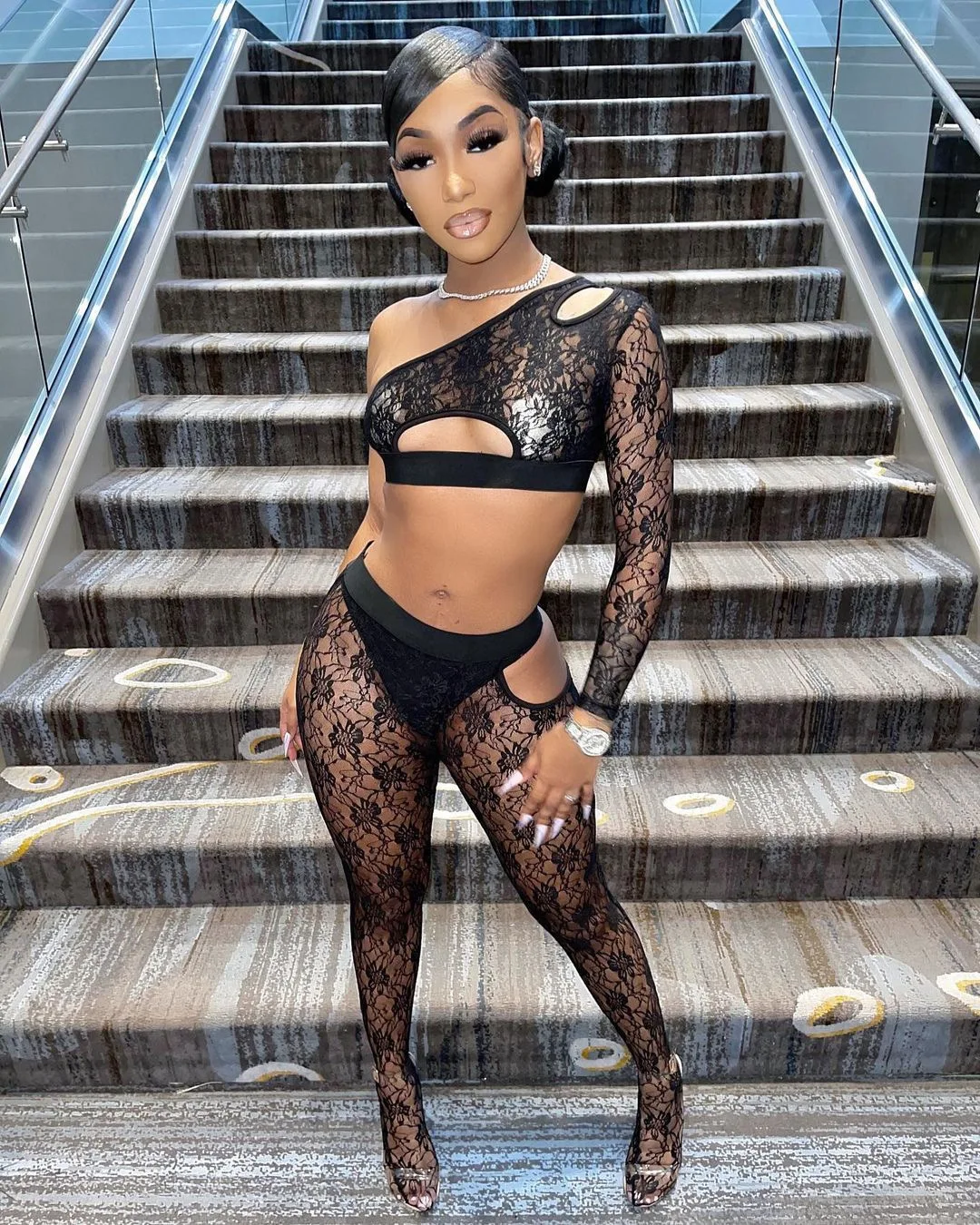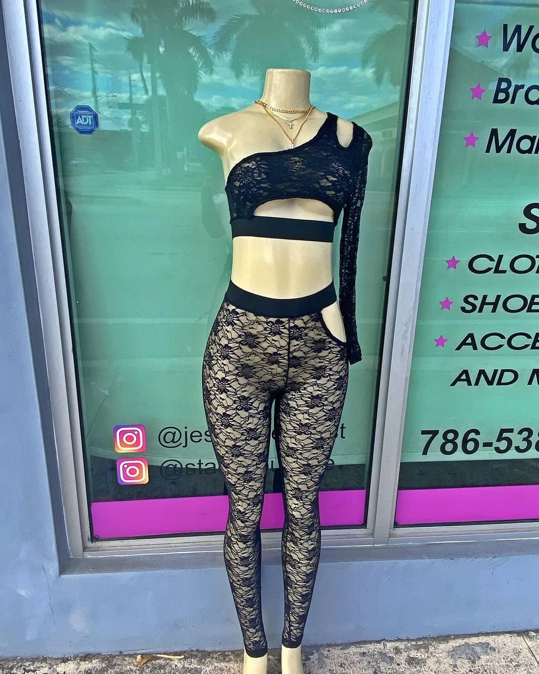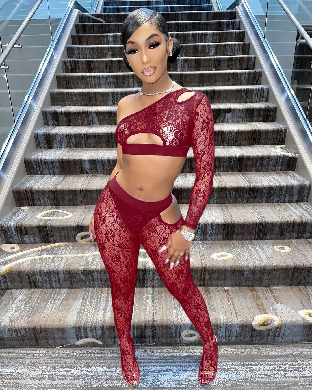 Women Lace Clubwear One Shoulder Hollow Out Crop Top See Through Sexy Lingerie 2 Piece Set