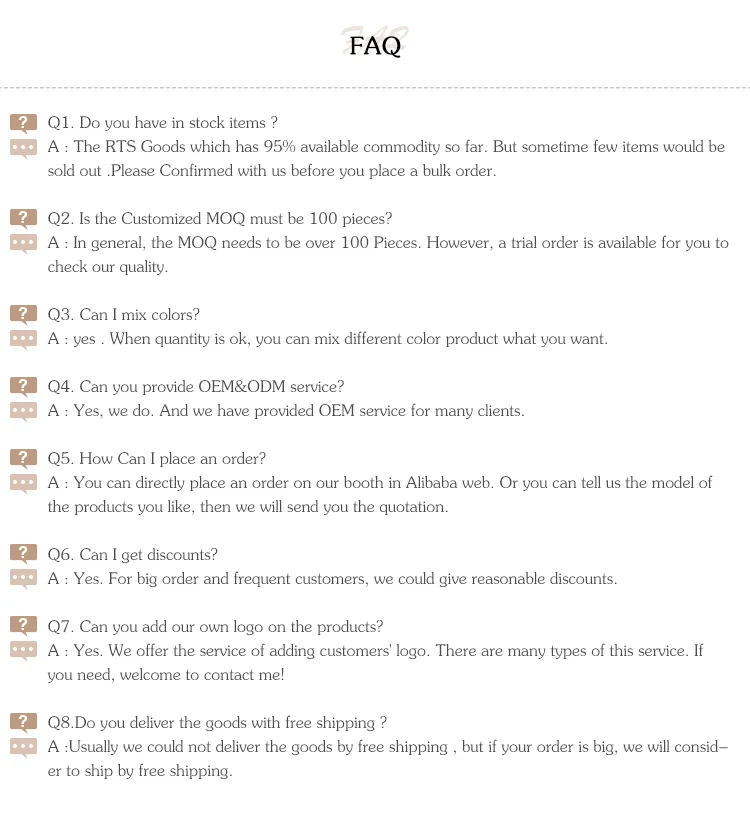 Delivery time | For stock Item:3-5 working days after receive full payment Custom order:13-20 Days after samples are confirmed |
